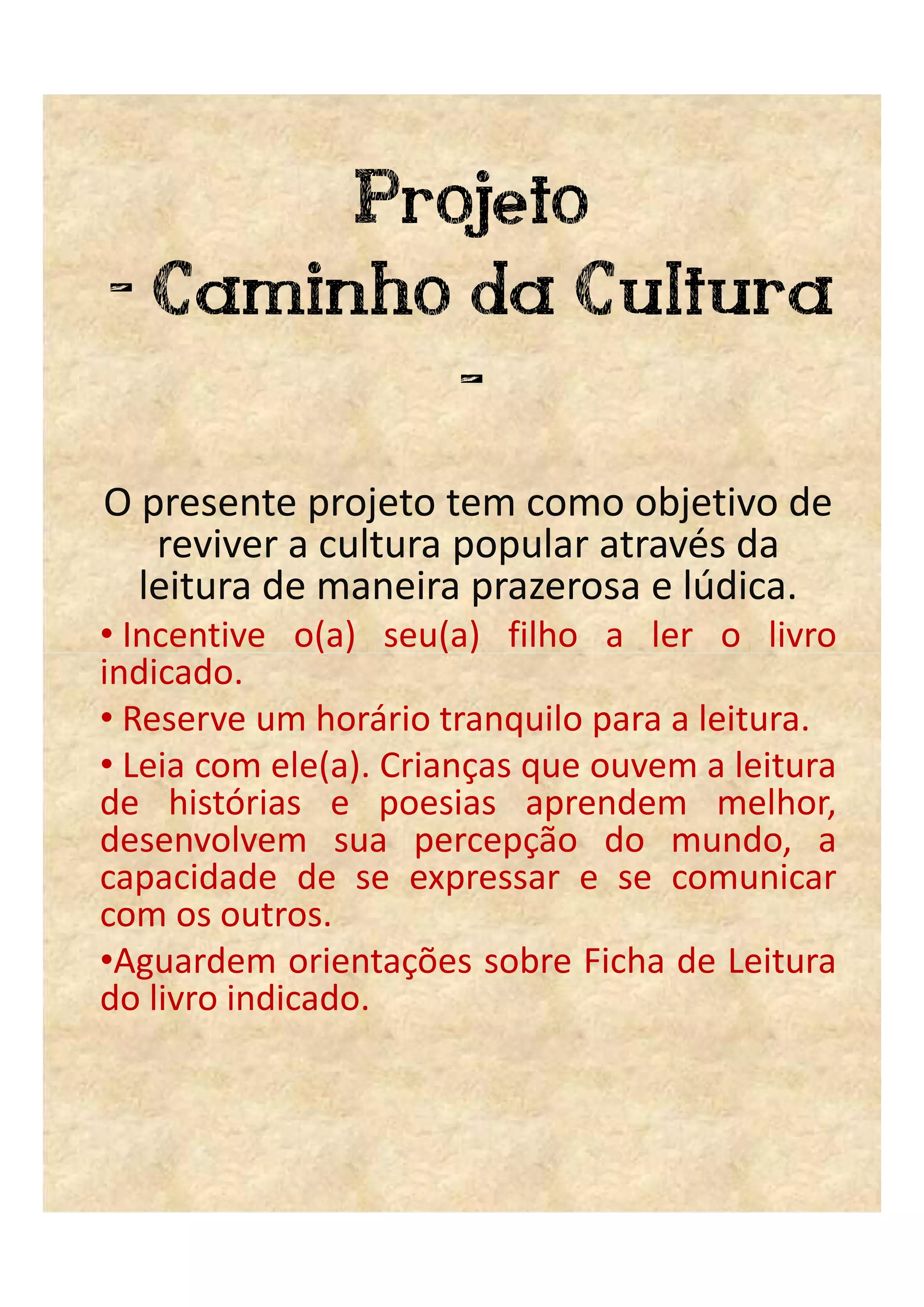 O projeto tem como objetivo reviver a cultura popular através da leitura prazerosa e lúdica com crianças. Ele incentiva os pais a lerem com seus filhos em horários tranquilos, o que ajuda no desenvolvimento e aprendizado das crianças.