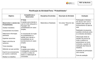 Este documento descreve uma atividade sobre probabilidades para alunos do 3o ciclo. A atividade visa desenvolver a compreensão dos alunos sobre probabilidades em casos simples através de aulas práticas e exercícios individuais. A avaliação será baseada na participação dos alunos e na qualidade do seu trabalho individual.