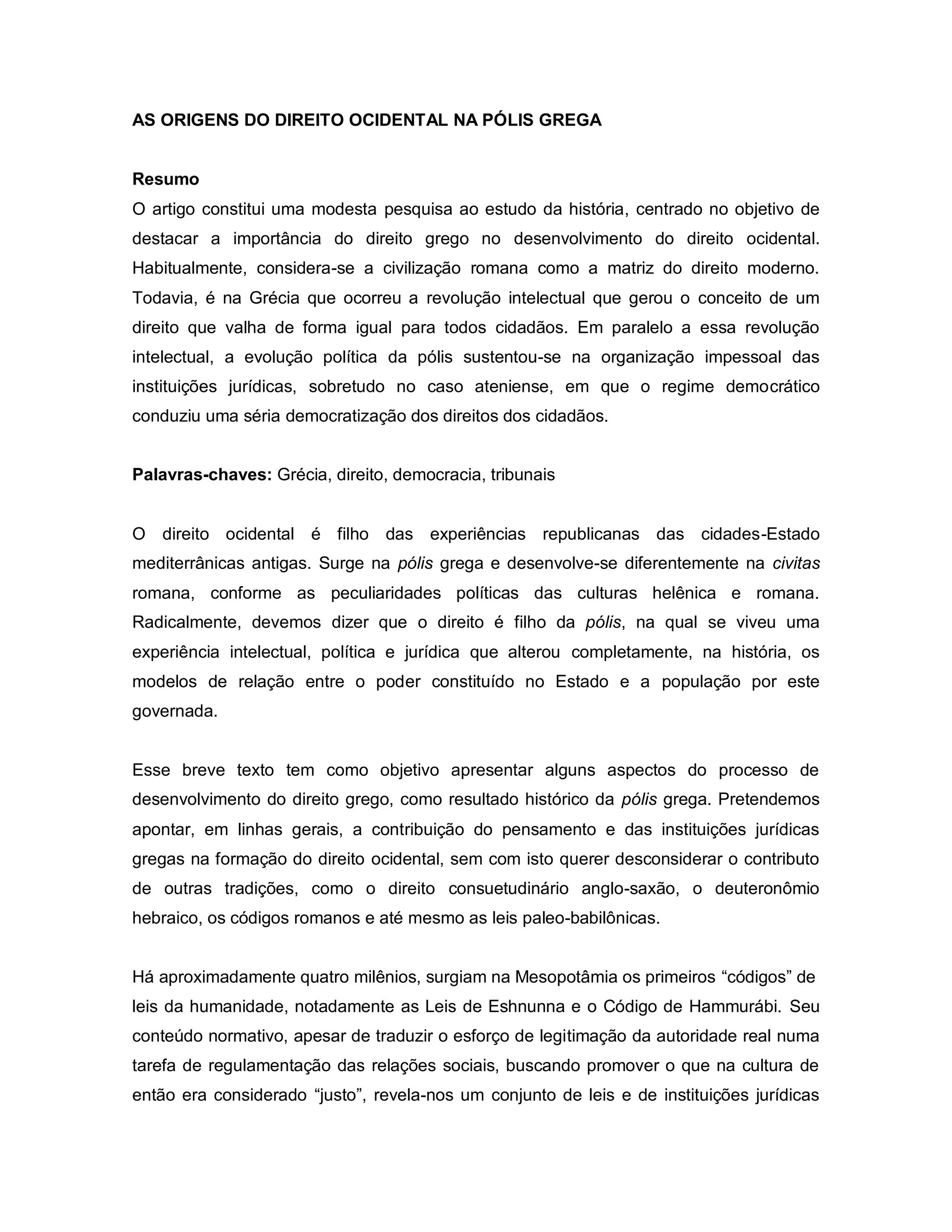 O documento discute as origens do direito ocidental na Grécia Antiga. O direito grego evoluiu de um sistema autoritário sob a monarquia para um sistema democrático na pólis, onde as leis valiam igualmente para todos os cidadãos e o poder era exercido pela comunidade. Isso influenciou profundamente o desenvolvimento do direito ocidental.