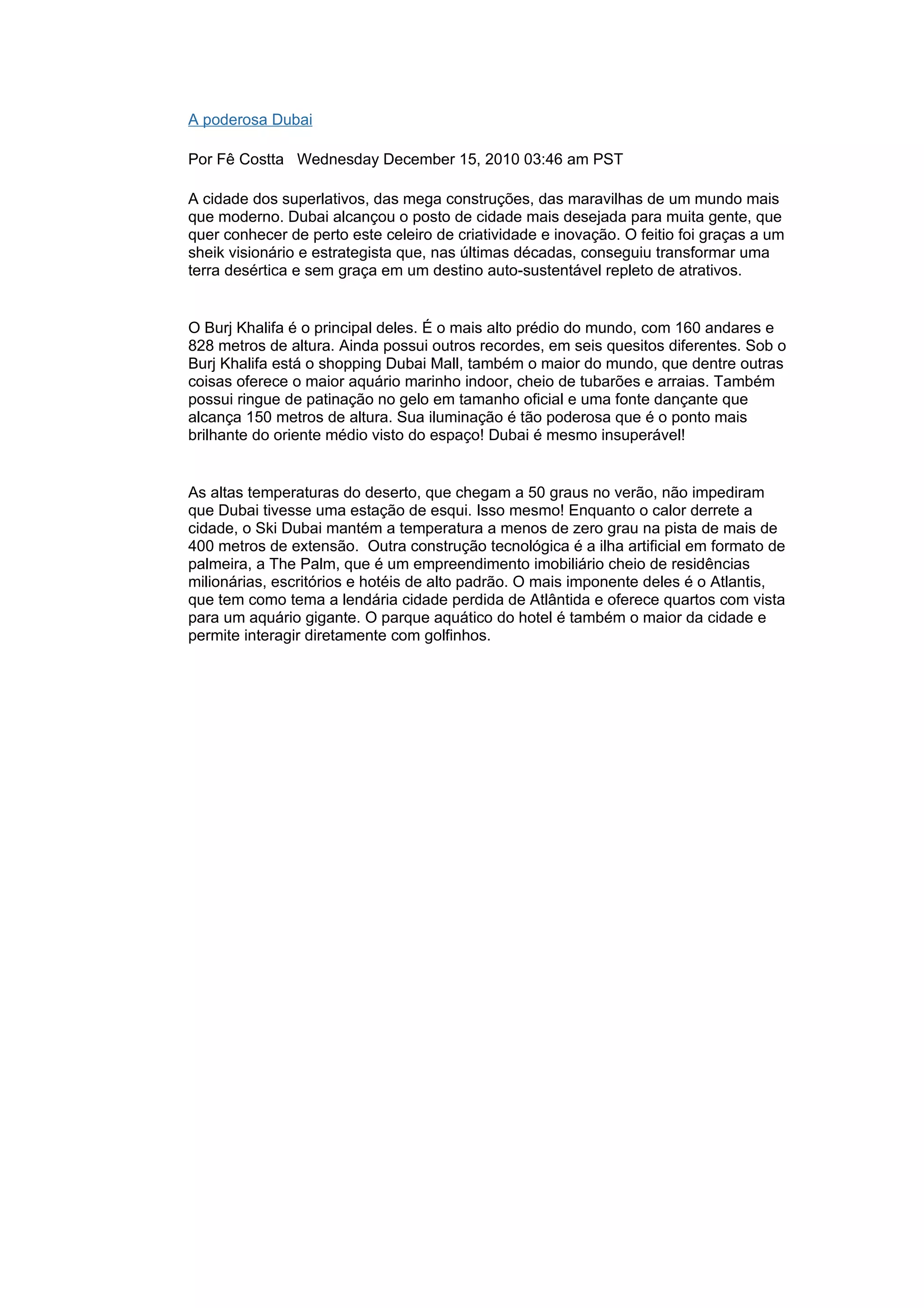 Dubai é uma cidade superlativa construída no deserto, com os prédios mais altos do mundo como o Burj Khalifa e ilhas artificiais. Sua economia diversificada e liderança visionária transformaram o local em um destino turístico global, apesar das altas temperaturas.