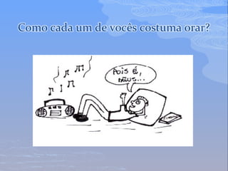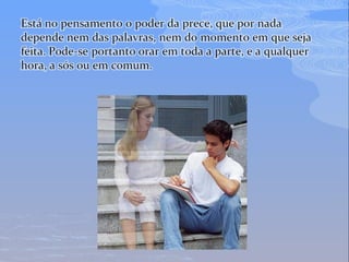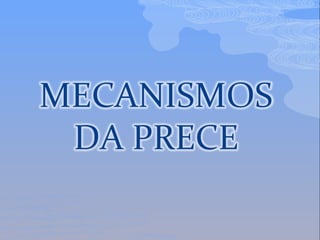 O documento discute a natureza e o propósito da prece, definindo-a como um ato de adoração a Deus e aos Espíritos por meio do pensamento, da aproximação e da comunicação. A prece serve para louvar, pedir e agradecer. Ela deve ser feita com humildade e sinceridade, não pela quantidade mas pela qualidade das palavras. A concentração e a vontade são essenciais para uma prece eficaz.