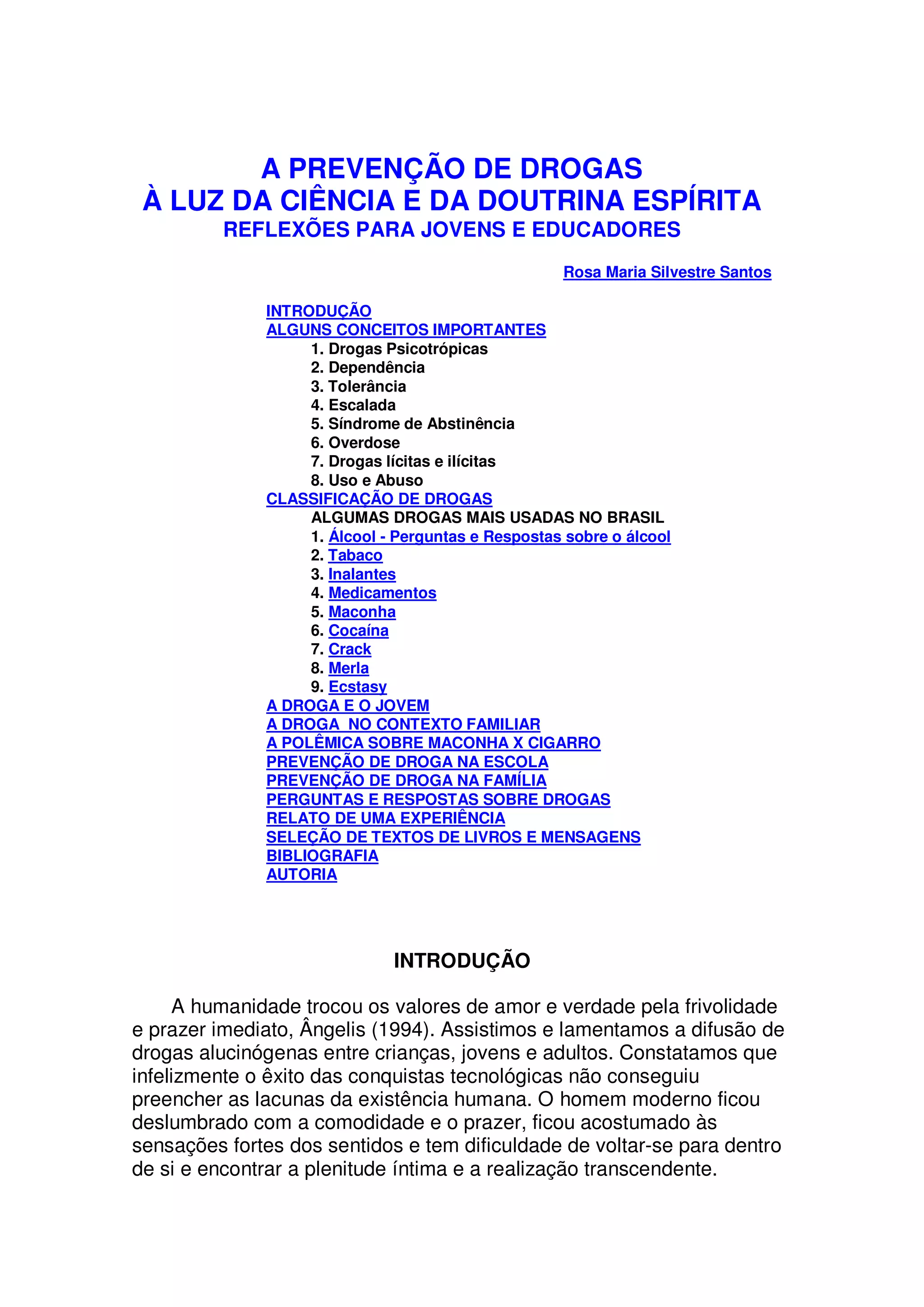 Este documento discute a prevenção de drogas à luz da ciência e da doutrina espírita. Apresenta conceitos importantes sobre drogas como dependência, tolerância e overdose. Classifica drogas em lícitas e ilícitas e discute as mais usadas no Brasil como álcool, tabaco, maconha e cocaína. Aborda a relação entre drogas e jovens, família e escola, enfatizando a importância da educação na prevenção.