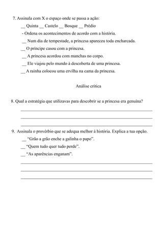 A história conta a chegada de uma princesa a um castelo durante uma tempestade. A rainha colocou uma ervilha na cama da princesa para testar se ela era genuína, já que o príncipe ainda não havia encontrado uma verdadeira princesa. Na manhã seguinte, a princesa tinha manchas no corpo por causa da ervilha, provando que era realmente uma princesa.
