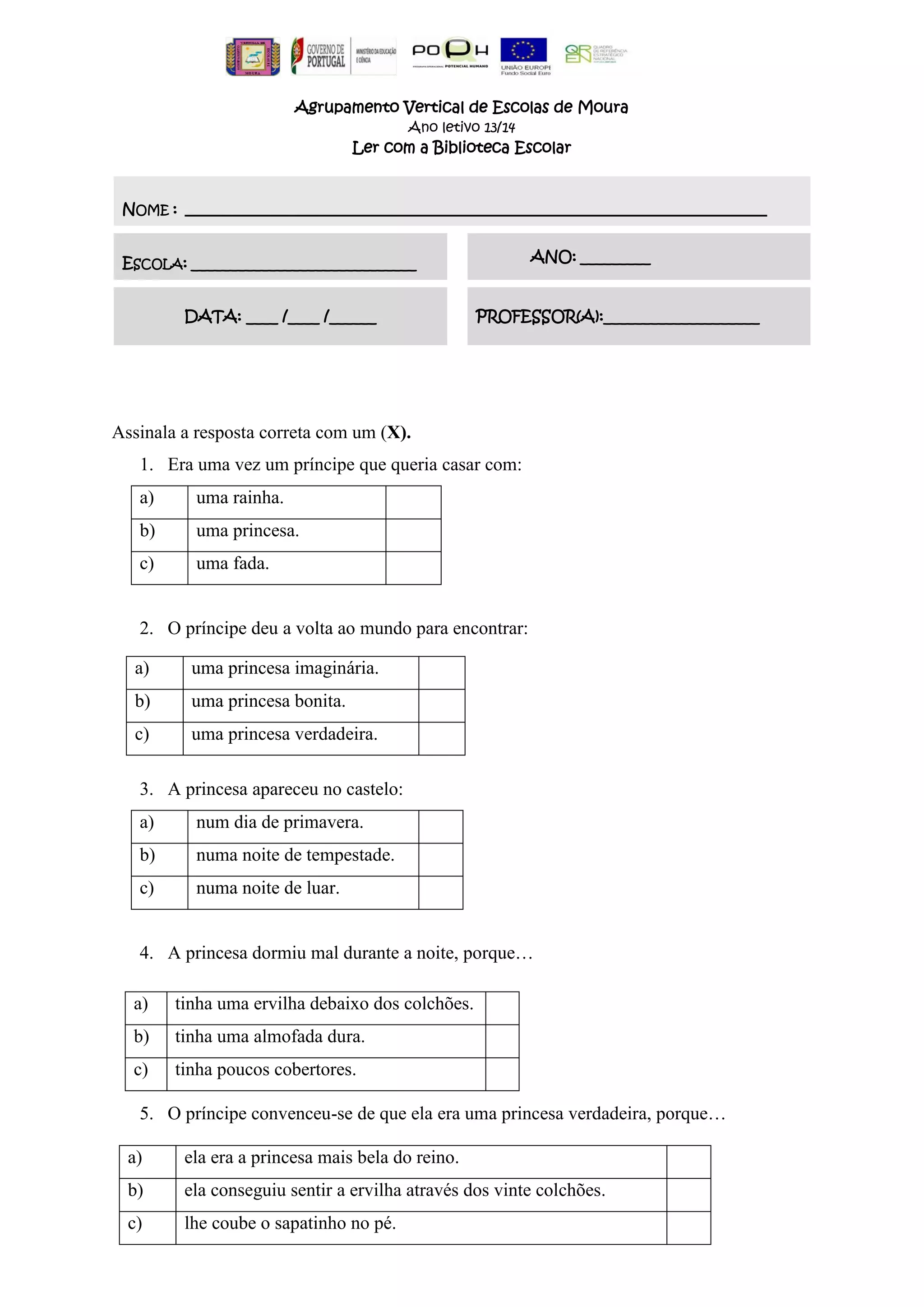 Este documento é um questionário sobre um conto de fadas que as crianças leram. O questionário contém perguntas de escolha múltipla sobre os detalhes da história, incluindo que um príncipe queria casar com uma princesa, deu a volta ao mundo para encontrá-la e percebeu que ela era verdadeira porque sentiu uma ervilha debaixo de vinte colchões.