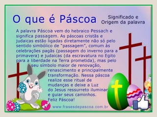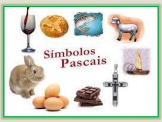 O documento descreve os principais símbolos da Páscoa Cristã, incluindo o pão e o vinho que representam o corpo e o sangue de Jesus, a cruz que simboliza a vitória sobre a morte, e ovos, coelhos e peixes que representam a renovação da vida e a ressurreição de Cristo.