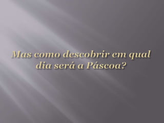 O documento explica que a Páscoa é uma festa cristã que celebra a ressurreição de Jesus Cristo e ocorre no primeiro domingo após a primeira lua cheia após o equinócio da primavera no hemisfério norte. Outros feriados religiosos como a Quaresma e a Ascensão são calculados em relação à data da Páscoa. O texto também fornece um método de cálculo para determinar a data exata da Páscoa em qualquer ano entre 1900 e 2199.