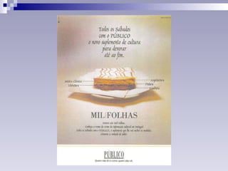 A LINGUAGEM… Frasesde tipo imperativo Ex.: “Compre já!” Abundância de recursos expressivos: - adjectivação Ex.: “DERCOS. Um tratamento verdadeiramente completo que torna por mais tempo os cabelos limpos, saudáveis e sedosos .” - repetição Ex.: “BANCO NACIONAL ULTRAMARINO. Pessoas experientes para pessoas exigentes.” - hipérbole Ex.: “IPSTM. O sistema de segurança inteligente que reage mais depressa que o perigo .” Rima – “Há mar e mar Há ir e voltar.”