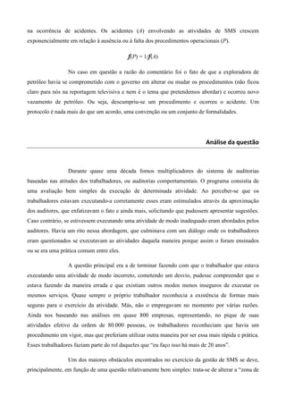 O documento discute a quebra de protocolos de segurança e como isso pode levar a acidentes. Ele resume as principais teorias sobre a relação entre desvios, acidentes e protocolos de segurança desenvolvidas por Heinrich, Bird e Dupont e propõe uma nova matriz de desvios. O autor argumenta que embora as estatísticas mudem, quebrar protocolos sempre representará riscos à segurança.