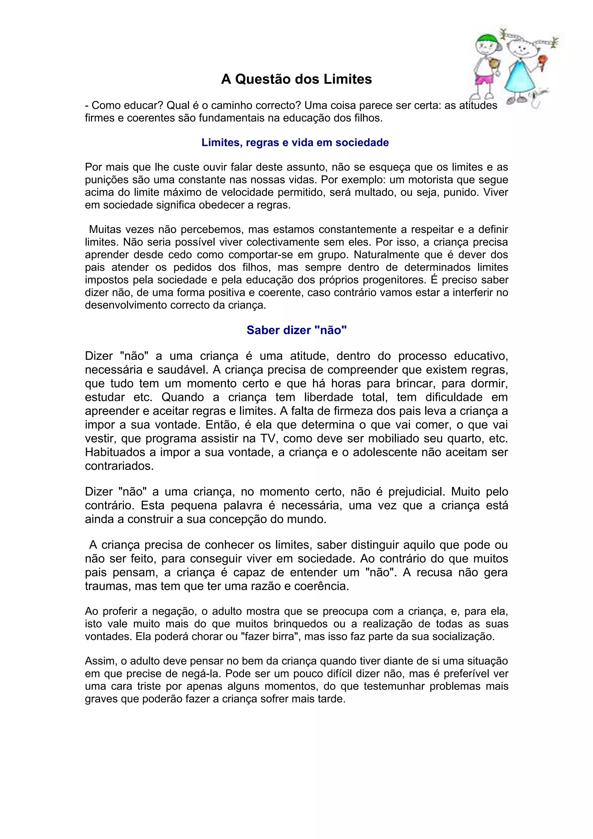 O documento discute a importância de limites e regras na educação de crianças. Afirma que limites claros e coerentes são fundamentais e que dizer "não" de forma positiva ajuda as crianças a desenvolverem compreensão de regras e limites sociais. Castigos devem ser apropriados e explicados para que crianças aprendam sobre responsabilidade pelos próprios atos.