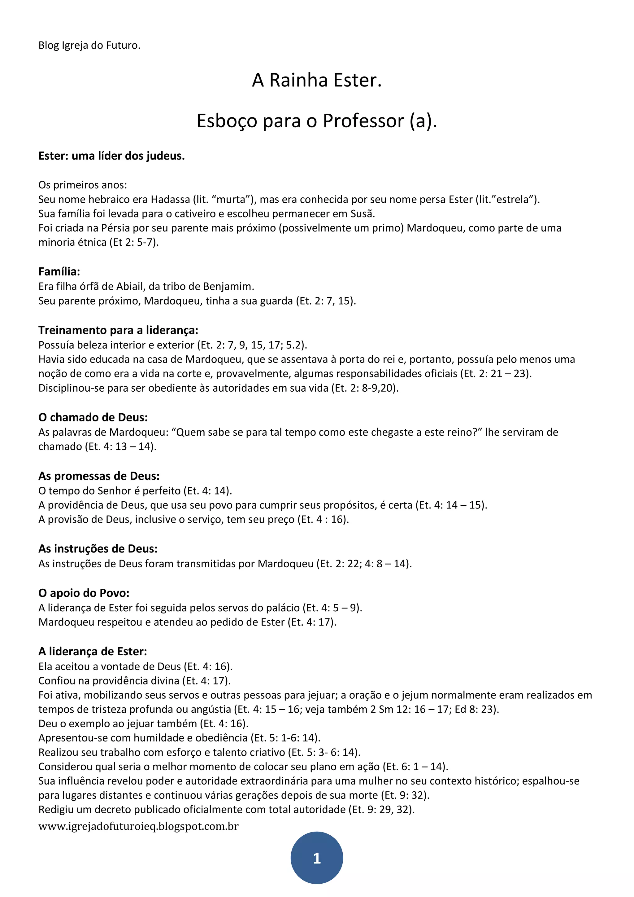 Ester foi uma líder judia órfã criada por seu parente Mardoqueu na Pérsia. Ela possuía beleza interior e exterior e foi educada para ter responsabilidades na corte real. Quando o rei Assuero decretou a morte dos judeus, Ester revelou coragem e astúcia para convencê-lo a revogar o decreto, salvando assim seu povo.