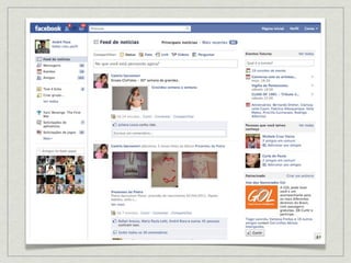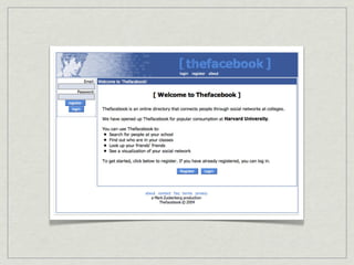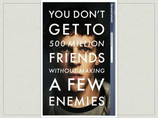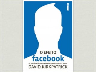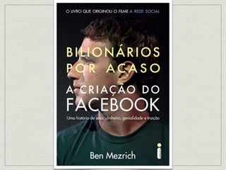 O documento discute a representação de eventos e figuras no filme sobre a criação do Facebook, destacando imprecisões e licenças artísticas. Aponta que a competição na Harvard é feroz e que a velocidade da rede influencia a rapidez nos negócios e valores morais. Além disso, ressalta a importância do Facebook, comparando-o ao Google em termos de tráfego e o impacto na privacidade e no compartilhamento de sentimentos.
