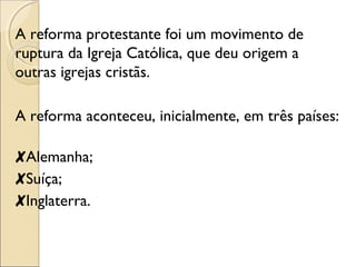 A Reforma Protestante foi um movimento que desafiou a Igreja Católica, resultando na criação de várias denominações cristãs, principalmente na Alemanha, Suíça e Inglaterra. Principais figuras como Martinho Lutero e João Calvino questionaram dogmas católicos e defenderam novas interpretações da Bíblia, além de criticar abusos dentro da igreja, como a venda de indulgências. A resposta da Igreja Católica incluiu o Concílio de Trento, que buscou reafirmar seus dogmas e conter a expansão do protestantismo.