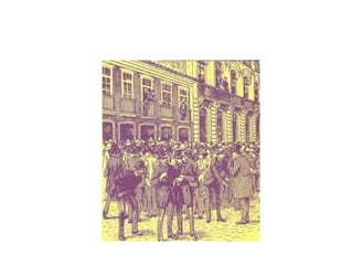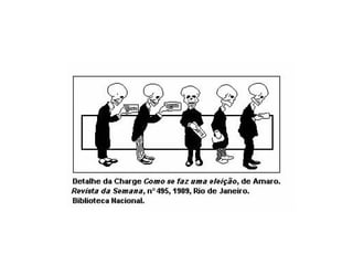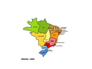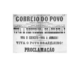 O documento descreve o período da República da Espada no Brasil entre 1889-1894, quando os militares controlavam o poder político após derrubarem a monarquia. O Marechal Deodoro da Fonseca liderou o movimento golpista e governou de 1889 a 1891, quando renunciou devido à crise econômica causada por sua política monetária. Seu vice, Marechal Floriano Peixoto, assumiu e governou de 1891 a 1894 enfrentando revoltas, como a dos estados federalistas, que foram sufocadas.