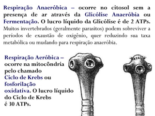 O documento discute os diferentes tipos de respiração em organismos, incluindo respiração anaeróbica e aeróbica, explicando os processos celulares e gasosos envolvidos. Também detalha os mecanismos respiratórios em vários grupos de animais, como invertebrados, anfíbios, moluscos e aves, destacando a complexidade do sistema respiratório em diferentes espécies. Adicionalmente, apresenta leis físicas que regem o comportamento dos gases e suas trocas em organismos vivos.