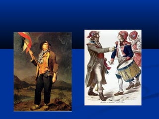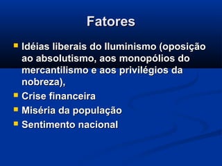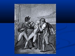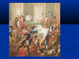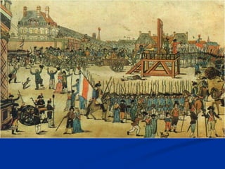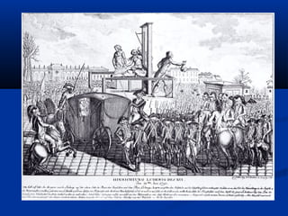 1) O documento descreve os principais fatores e eventos da Revolução Francesa entre 1789-1799, incluindo a convocação dos Estados Gerais, a tomada da Bastilha, a execução de Luís XVI, o período do Terror sob Robespierre, e o golpe de Napoleão que marcou o fim do Diretório.