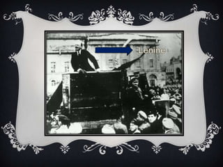 O documento descreve a Revolução Russa de 1917, começando com as condições na Rússia antes da revolução, incluindo o regime autocrático do Czar Nicolau II e o descontentamento generalizado do povo. A revolução de Fevereiro derrubou o Czar e estabeleceu um governo provisório, mas os Bolcheviques liderados por Lenine tomaram o poder na Revolução de Outubro, estabelecendo o primeiro Estado socialista no mundo.