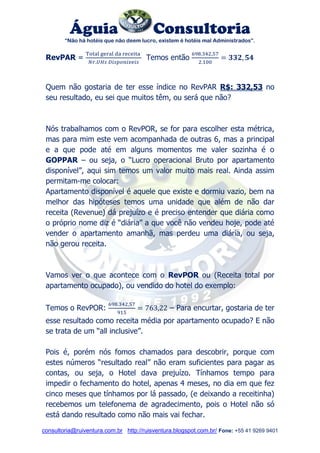 O documento discute a importância de métricas de gestão hoteleira, como revpar e goppar, enfatizando que a má administração é a verdadeira causa de hotéis não lucrativos. Fornece um exemplo concreto de um hotel com 43,6% de ocupação que, após intervenções adequadas, começou a dar lucro. A consultoria argumenta que existem caminhos e sugestões que podem transformar a gestão de hotéis em rentável.