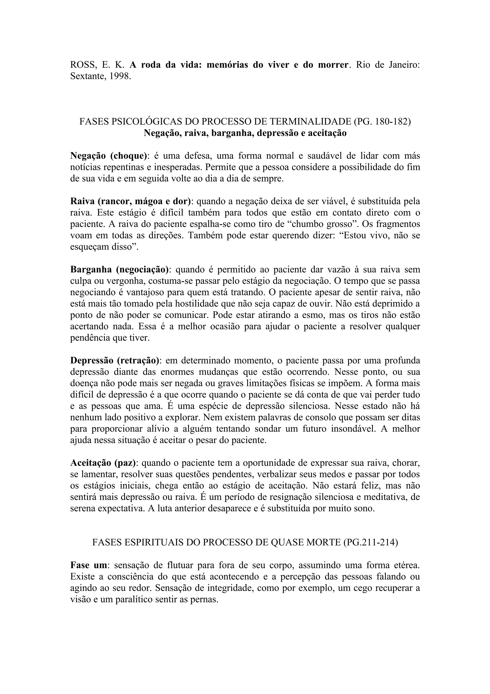 O documento descreve as fases psicológicas e espirituais do processo de terminalidade e quase morte, incluindo: (1) Negação, raiva, barganha, depressão e aceitação como fases psicológicas; (2) Sensação de flutuar fora do corpo, deixar o corpo para trás, visualizar uma luz brilhante através de um túnel e perceber a presença da Fonte Superior como fases espirituais.