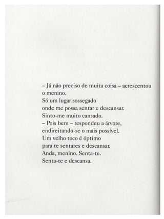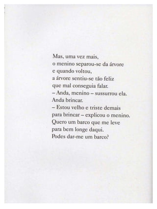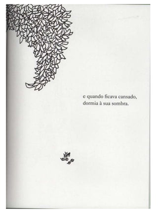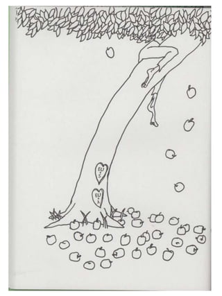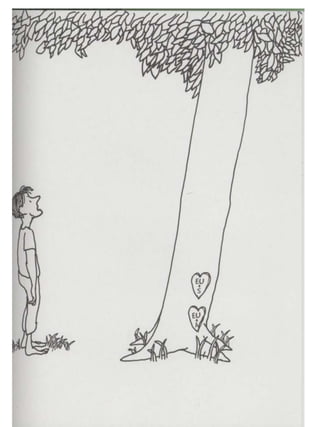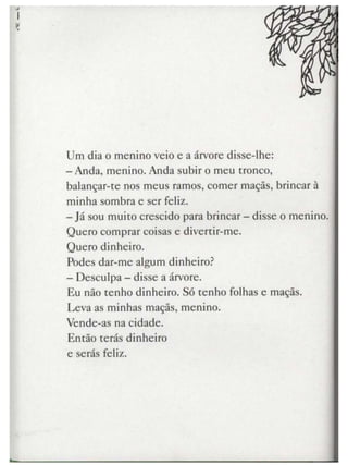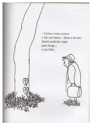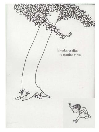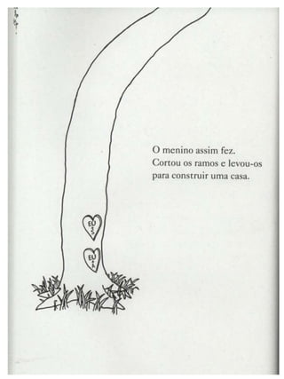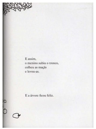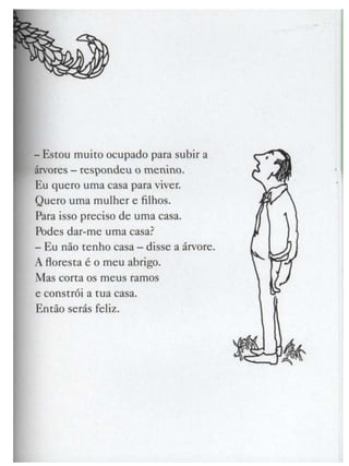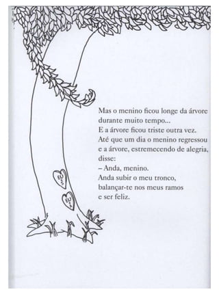 Uma árvore era feliz quando um menino subia em seu tronco, mas ficou sozinha quando o menino cresceu. Apesar da solidão, a árvore continuou feliz.