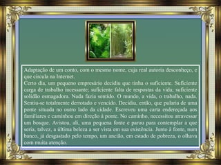 O documento conta a história de um empresário que se sentiu derrotado e decidiu suicidar-se. No caminho para a ponte, ele encontra um ancião que conta a história do bambu, que demora 5 anos para crescer suas raízes antes de emergir. O ancião diz que a dor do empresário é como o crescimento das raízes do bambu e que não deve desistir, assim como a vida não desiste do bambu.
