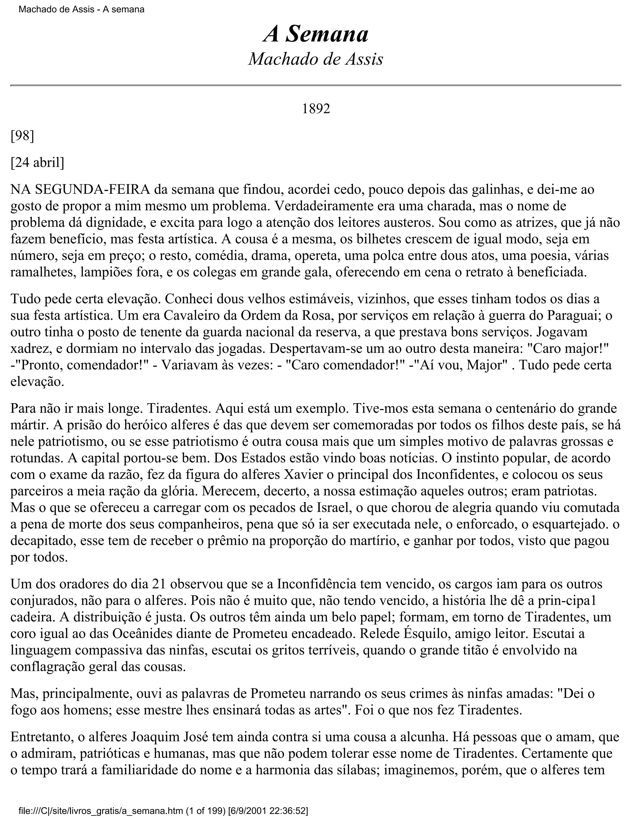 2) Na quarta-feira, ocorreu o centenário do herói Tiradentes, que o autor vê como o principal líder da Inconfidência Mineira.