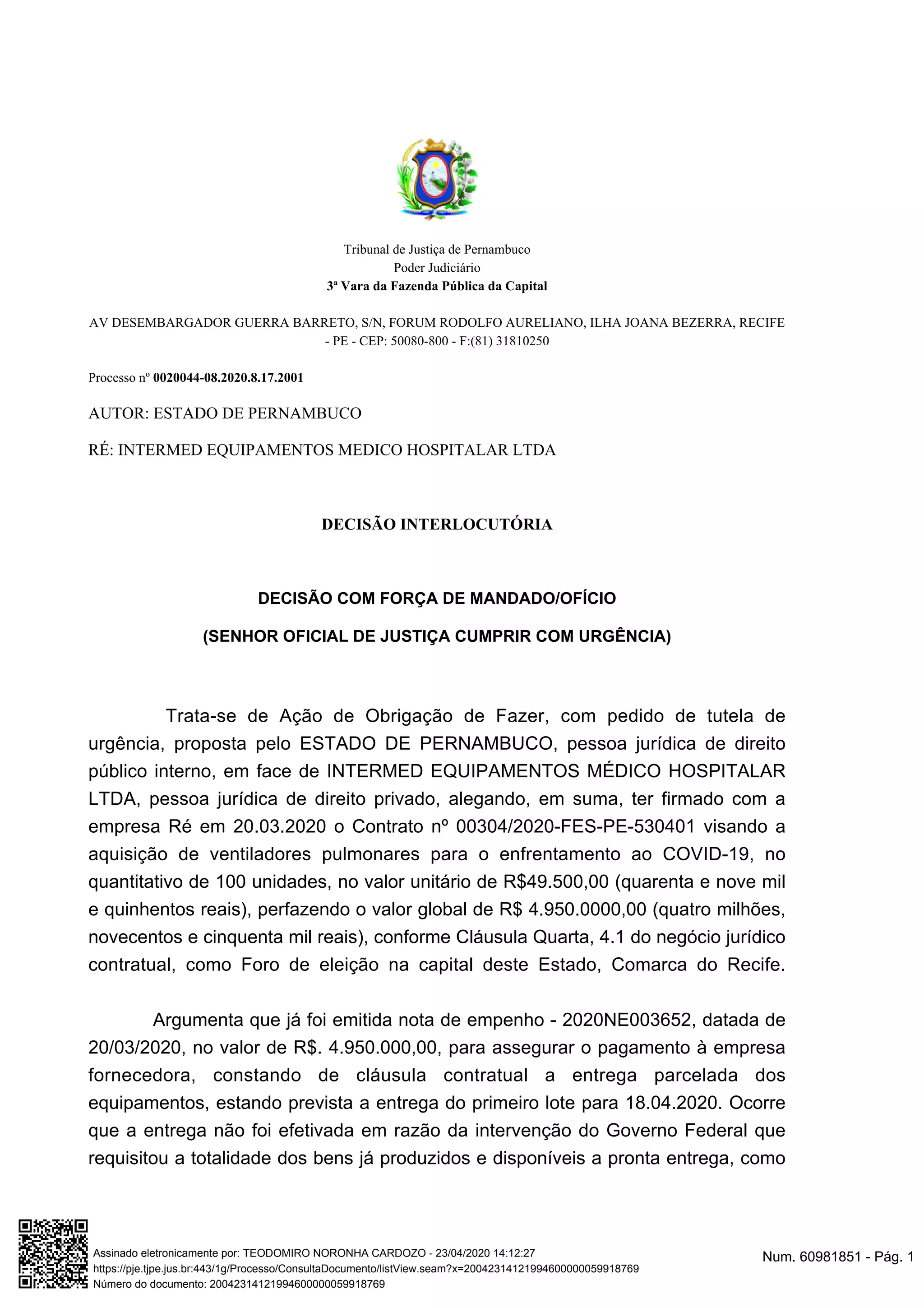 1. O Estado de Pernambuco moveu ação contra a Intermed para obrigá-la a fornecer 100 ventiladores pulmonares adquiridos em contrato de março de 2020.