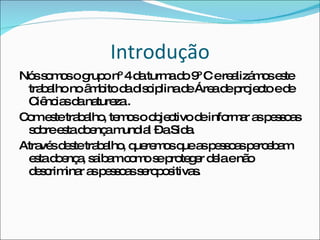 Este documento fornece informações sobre HIV/AIDS. Explica o que é HIV e AIDS, como se transmite o vírus, e os efeitos no corpo humano. Também discute a discriminação social contra pessoas soropositivas e enfatiza a importância de aceitação e apoio em vez de medo ou rejeição.