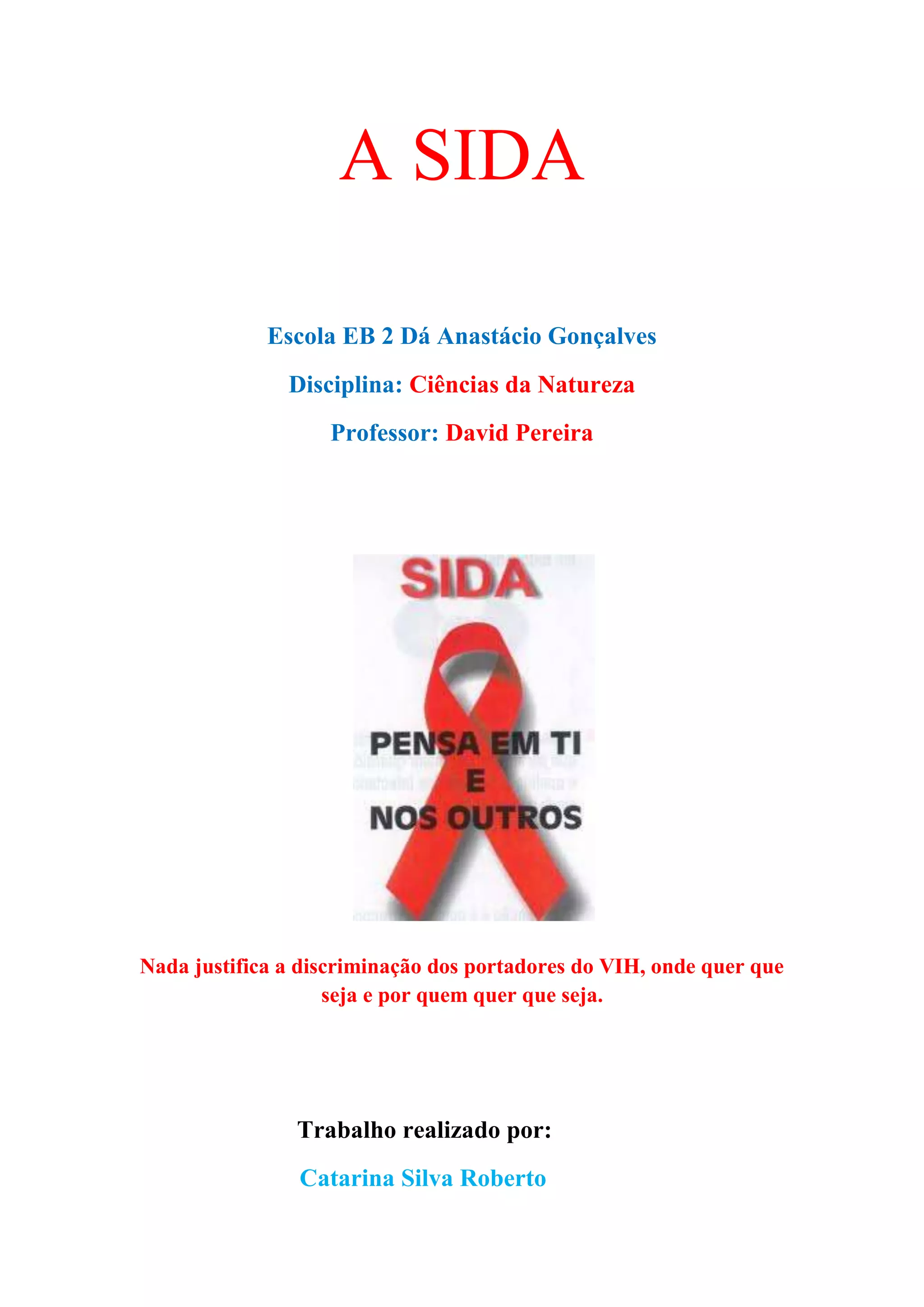 O documento descreve como a SIDA é transmitida principalmente através de relações sexuais desprotegidas e contacto com sangue infectado. O modo mais eficaz de prevenção é o uso correto de preservativos masculinos ou femininos durante as relações sexuais. O documento também destaca a importância de não discriminar as pessoas portadoras do vírus HIV.