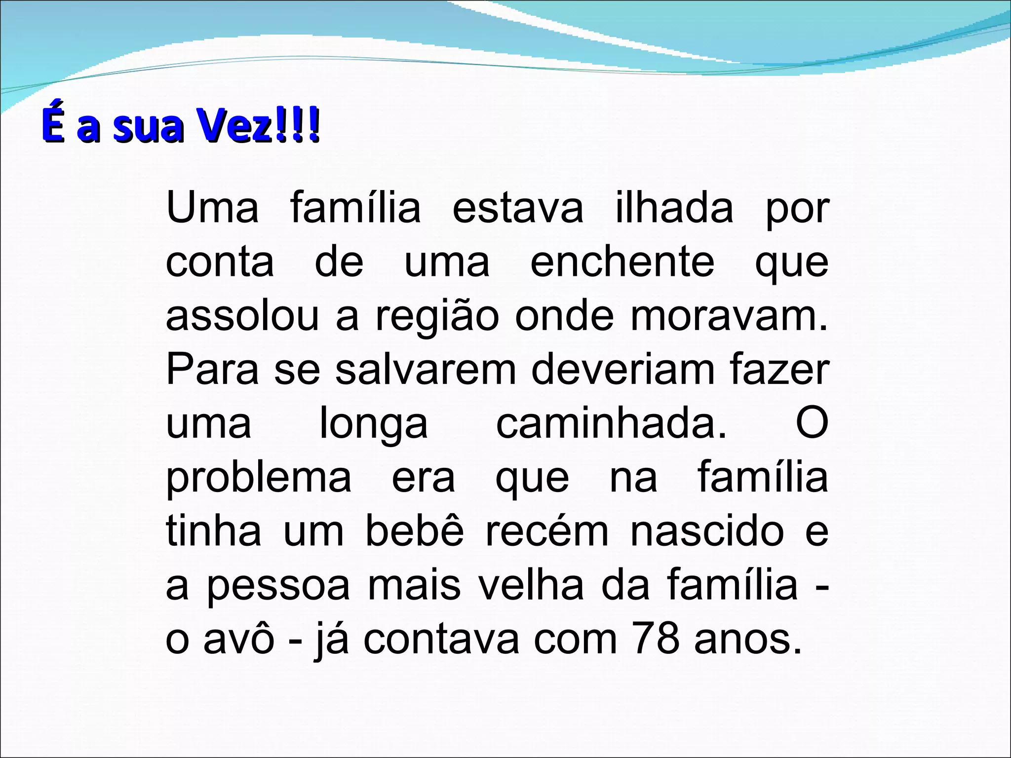 Uma família ficou ilhada por uma enchente e precisou fazer uma longa caminhada para escapar, levando um bebê recém-nascido e um avô de 78 anos. Na subida de uma montanha, o avô ficou exausto e pediu para ser deixado para trás, mas o filho o convenceu a continuar carregando o bebê, o que deu forças para completar a jornada.