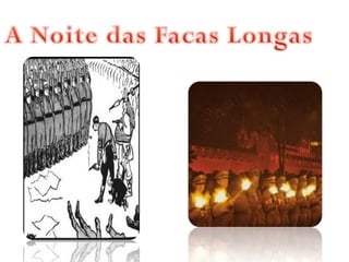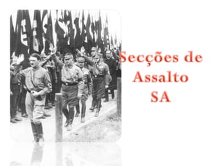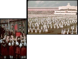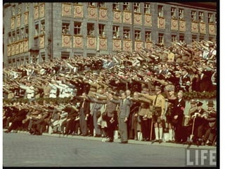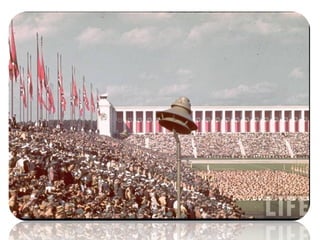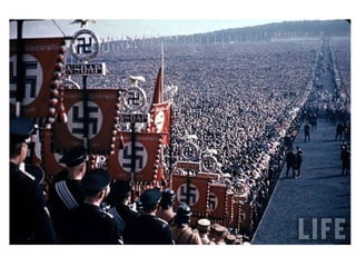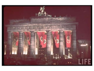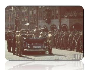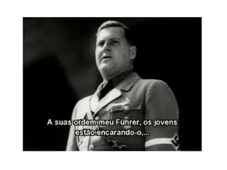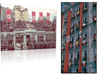 O documento descreve como a Alemanha estava em uma situação difícil após a Primeira Guerra Mundial, com desemprego e dívidas de guerra. Isso levou muitos alemães, incluindo o narrador quando criança, a acreditarem nas promessas do Partido Nazista de acabar com os problemas e unir o país. O documento também mostra um discurso de 1933 pedindo votos para Hitler antes das eleições.