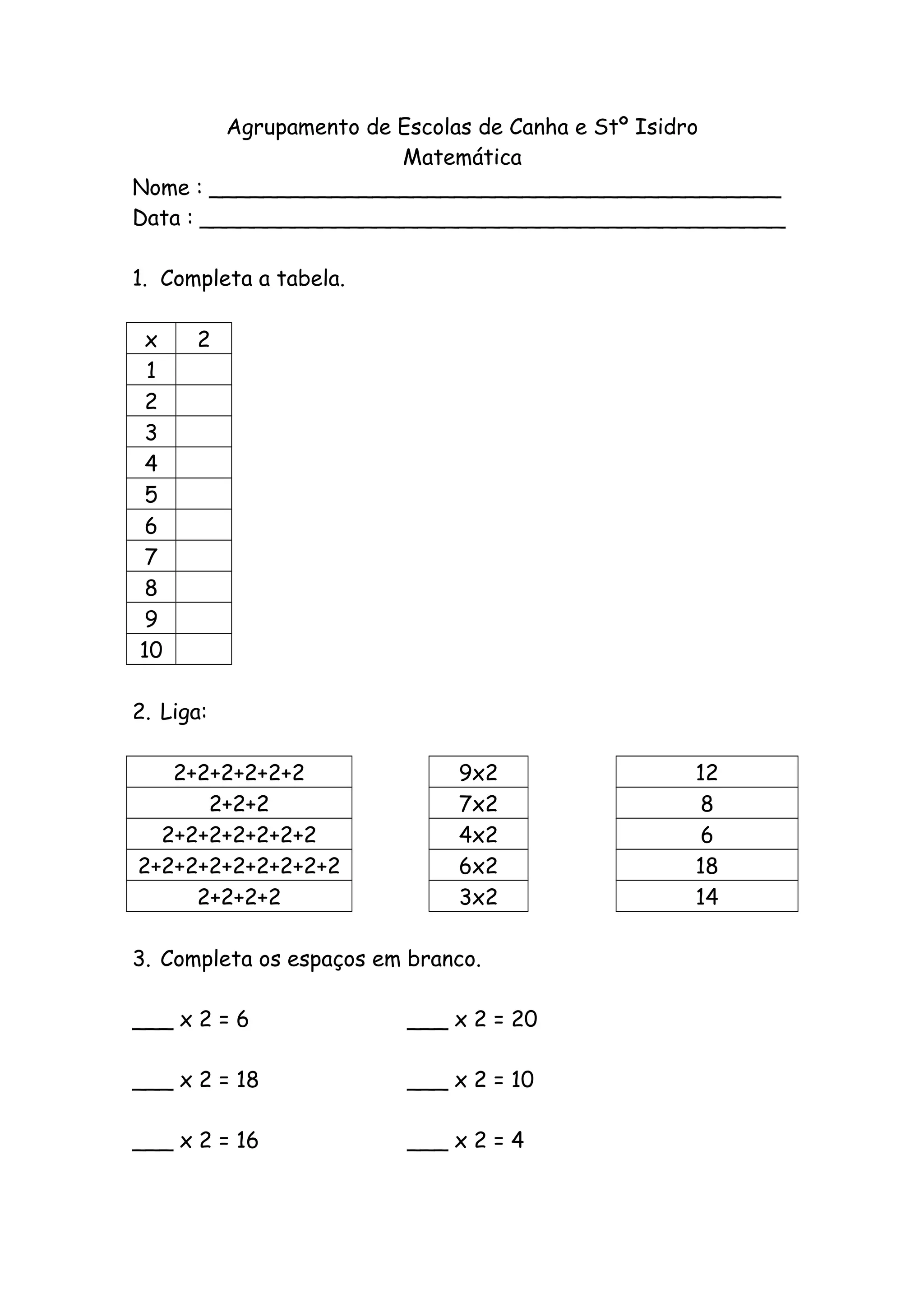 Este documento contém um teste de matemática com 3 questões. A primeira pede para completar uma tabela multiplicando números de 1 a 10 por 2. A segunda pede para calcular a soma de vários termos multiplicados por 2. A terceira pede para completar espaços em branco com números que quando multiplicados por 2 dêem certos resultados.