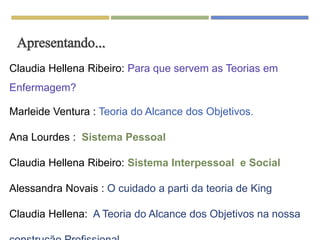 O documento apresenta uma discussão sobre a Teoria do Alcance dos Objetivos de Imogene King durante uma rodada de seminários sobre Processos de Cuidar I. A teoria é explicada com base nos sistemas pessoal, interpessoal e social e no processo de enfermagem de King, que envolve interação, diagnóstico, metas, meios e evolução. A aplicação da teoria no cuidado e na formação profissional também é discutida.