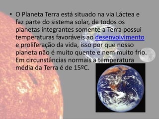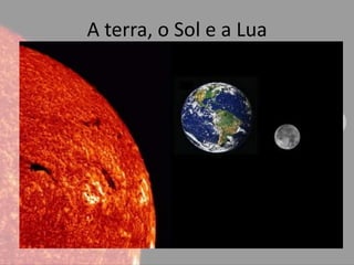 O documento descreve a Terra, o Sol e a Lua. A Terra possui temperaturas adequadas para a vida devido à sua distância do Sol. Sua atmosfera contém gases retidos pela gravidade e campo magnético, dando à Terra seu aspecto azulado. O Sol é o objeto mais proeminente no sistema solar e fornece energia vital à Terra. A Lua é o maior satélite natural e suas fases ocorrem a cada 7-8 dias conforme seu ângulo em relação ao Sol.