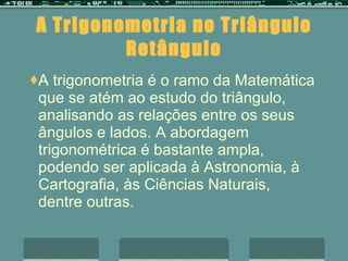O documento discute a trigonometria em triângulos retângulos, definindo seno, co-seno e tangente em termos das relações entre os lados e ângulos. Ele fornece um exemplo de como calcular a altura de um prédio usando a tangente do ângulo de 60 graus e as relações trigonométricas.