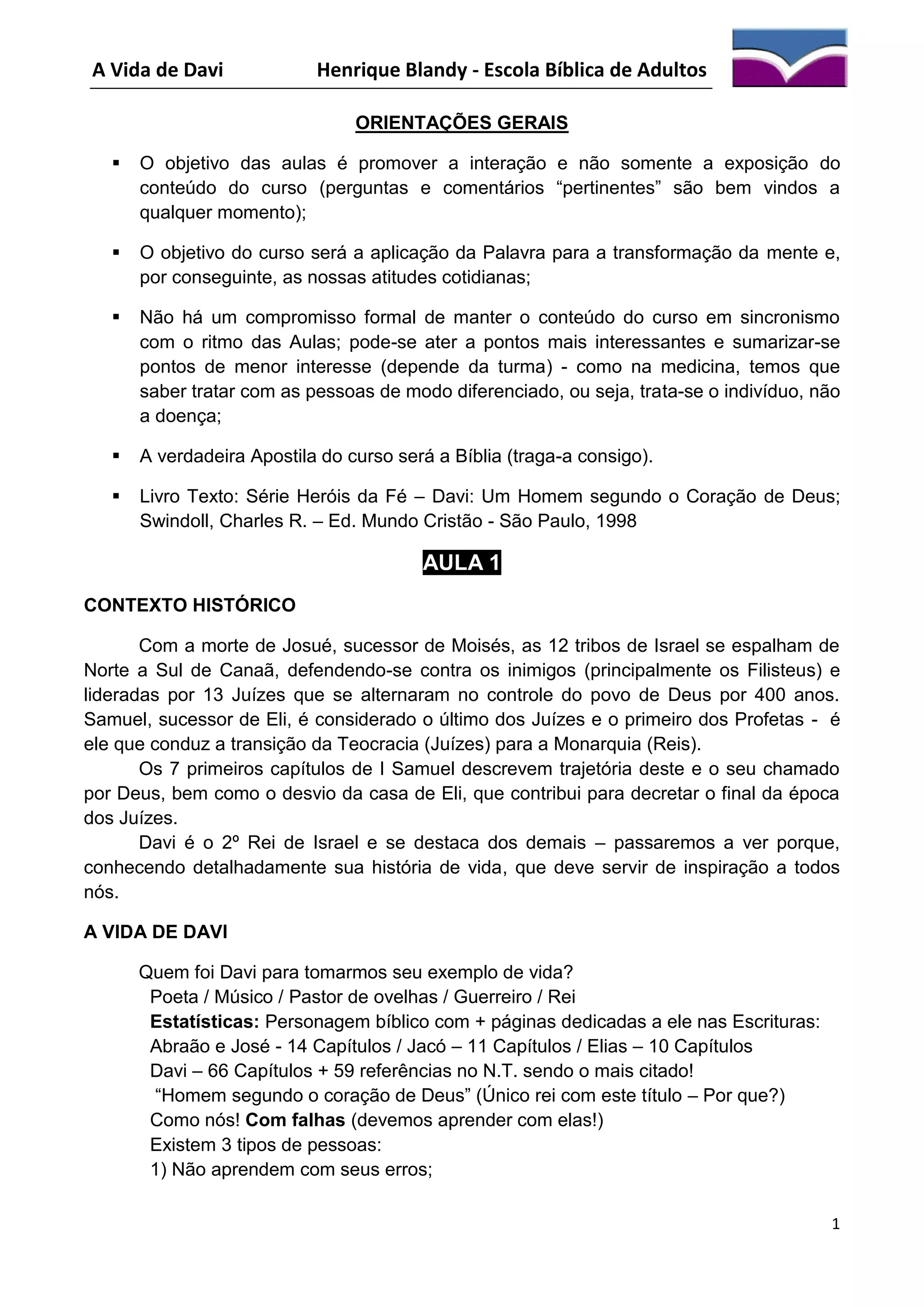 O documento apresenta as orientações gerais para o curso "A Vida de Davi". O objetivo é promover a interação entre os alunos e aplicar a Palavra de Deus para transformar mentes e atitudes. O curso usará a Bíblia como principal material e livro sobre a vida de Davi. A primeira aula apresenta o contexto histórico da época de Davi e como ele foi escolhido por Deus, não pelos critérios humanos.