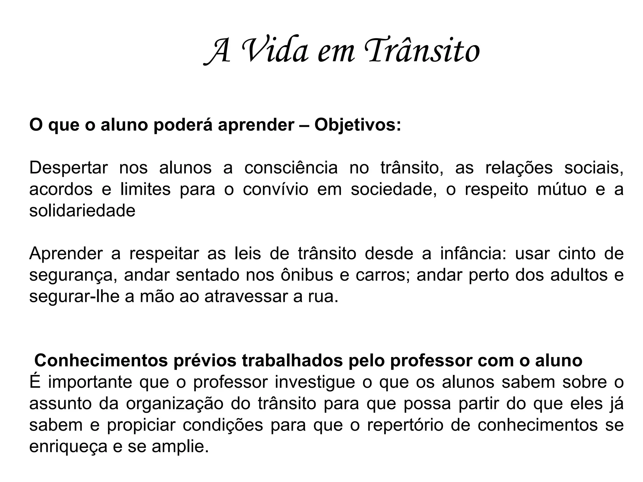 A Vida emTrânsito O que o aluno poderá aprender – Objetivos: Despertar nos alunos a consciência no trânsito, as relações sociais, acordos e limites para o convívio em sociedade, o respeito mútuo e a solidariedade Aprender a respeitar as leis de trânsito desde a infância: usar cinto de segurança, andar sentado nos ônibus e carros; andar perto dos adultos e segurar-lhe a mão ao atravessar a rua. Conhecimentos prévios trabalhados pelo professor com o aluno É importante que o professor investigue o que os alunos sabem sobre o assunto da organização do trânsito para que possa partir do que eles já sabem e propiciar condições para que o repertório de conhecimentos se enriqueça e se amplie.