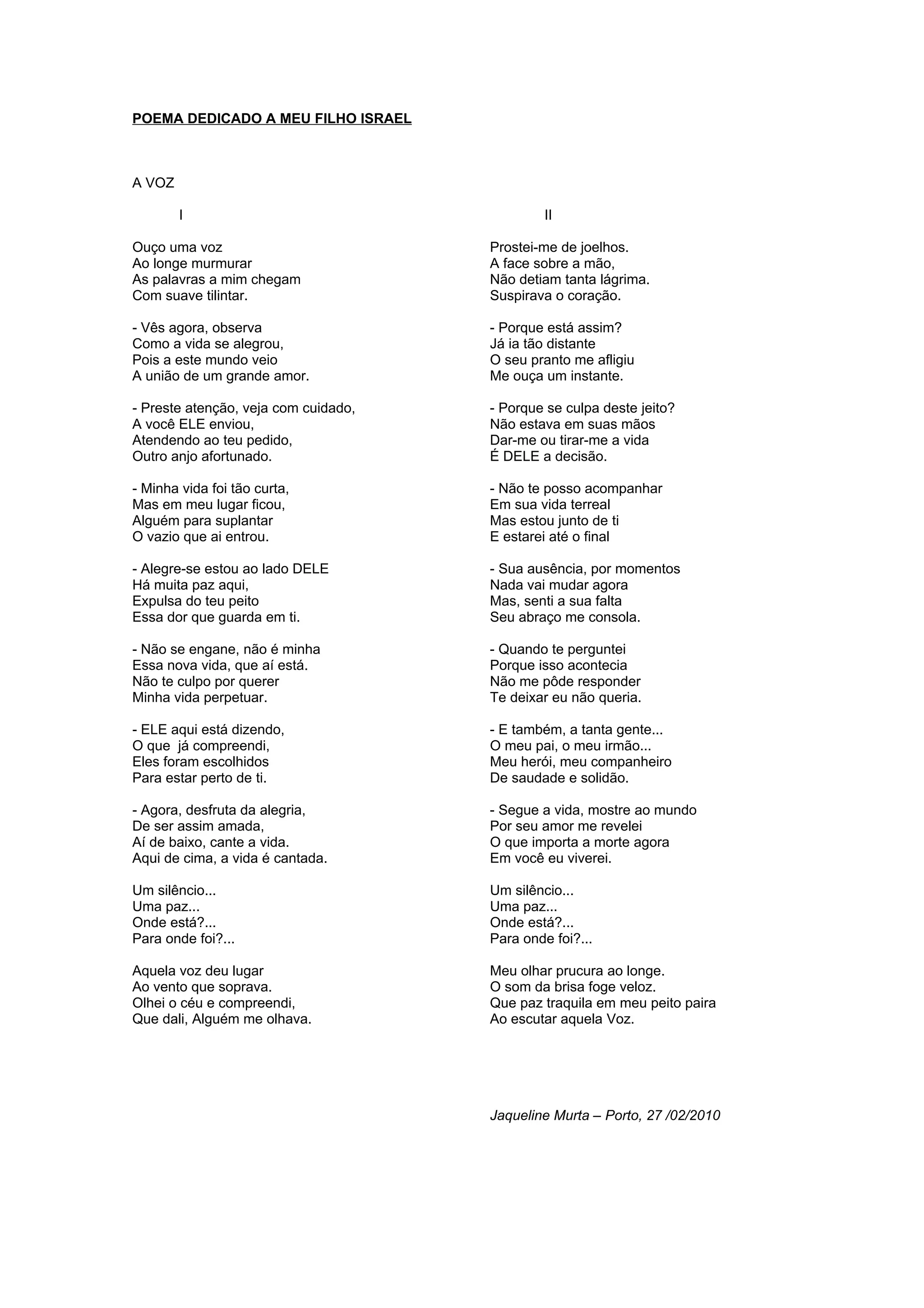 O poema é dedicado ao filho do autor, Israel. Ele descreve ouvir uma voz suave o confortando, dizendo que, embora sua vida tenha sido curta, ele deixou alguém (seu filho) para preencher o vazio. A voz diz que está em paz e que não culpa o filho por querer perpetuar sua vida. Pede ao filho para desfrutar do amor que recebe e mostrar ao mundo por que se revelou através de seu amor.