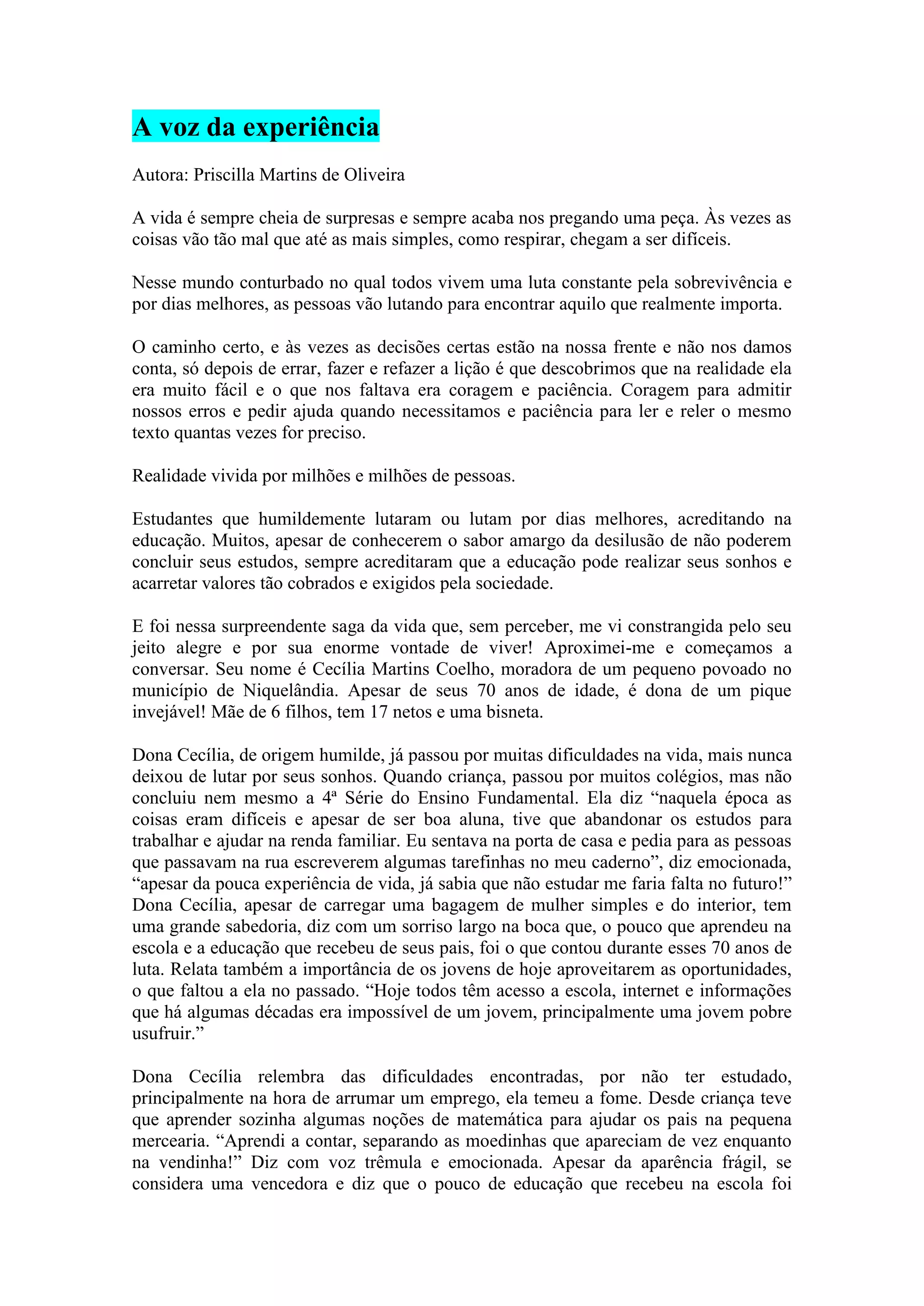 O documento conta a história de Dona Cecília, uma mulher de 70 anos que teve que abandonar os estudos na quarta série para ajudar a família. Apesar das dificuldades, ela sempre acreditou na educação. Hoje, ela reflete sobre a importância da escola para a formação do caráter e garantia do futuro, incentivando os jovens a aproveitarem as oportunidades educacionais.