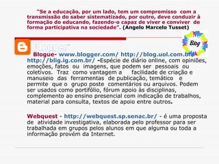 O documento descreve várias ferramentas da Web 2.0 que podem ser usadas na educação, incluindo blogs, wikis, repositórios de vídeos e fotos online, mapas conceituais, salas de aula virtuais e ferramentas do Google. O texto argumenta que essas tecnologias podem ajudar a promover novas formas de aprendizado e interação entre professores e alunos.