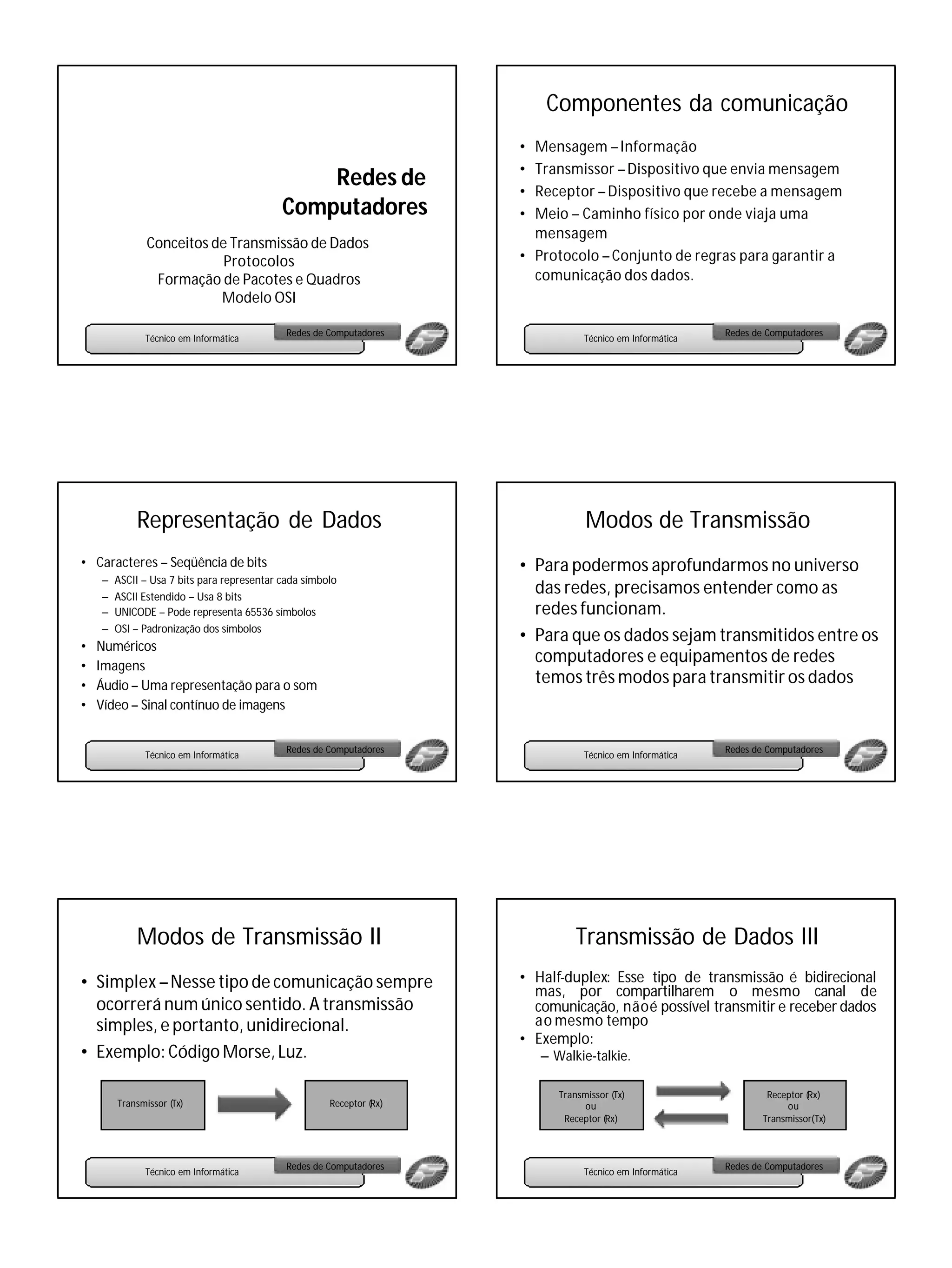 1) Os componentes da comunicação em redes como mensagens, transmissores, receptores e meios de transmissão.