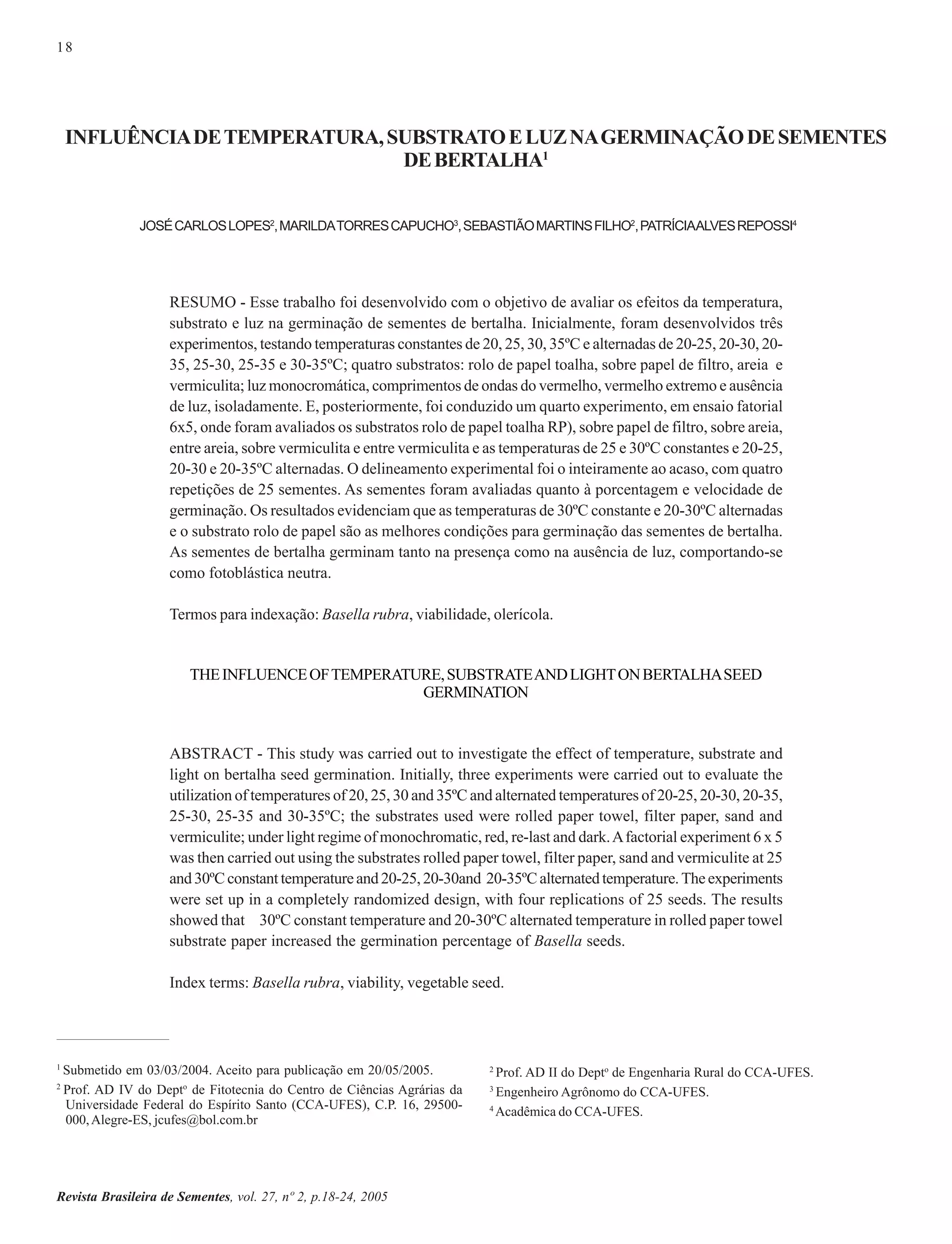 Este estudo avaliou o efeito da temperatura, substrato e luz na germinação de sementes de bertalha. As temperaturas alternadas de 20-35°C e 25-35°C e o substrato de rolo de papel produziram as maiores taxas de germinação. As sementes de bertalha germinaram tanto na presença quanto na ausência de luz, comportando-se como fotoblásticas neutras.