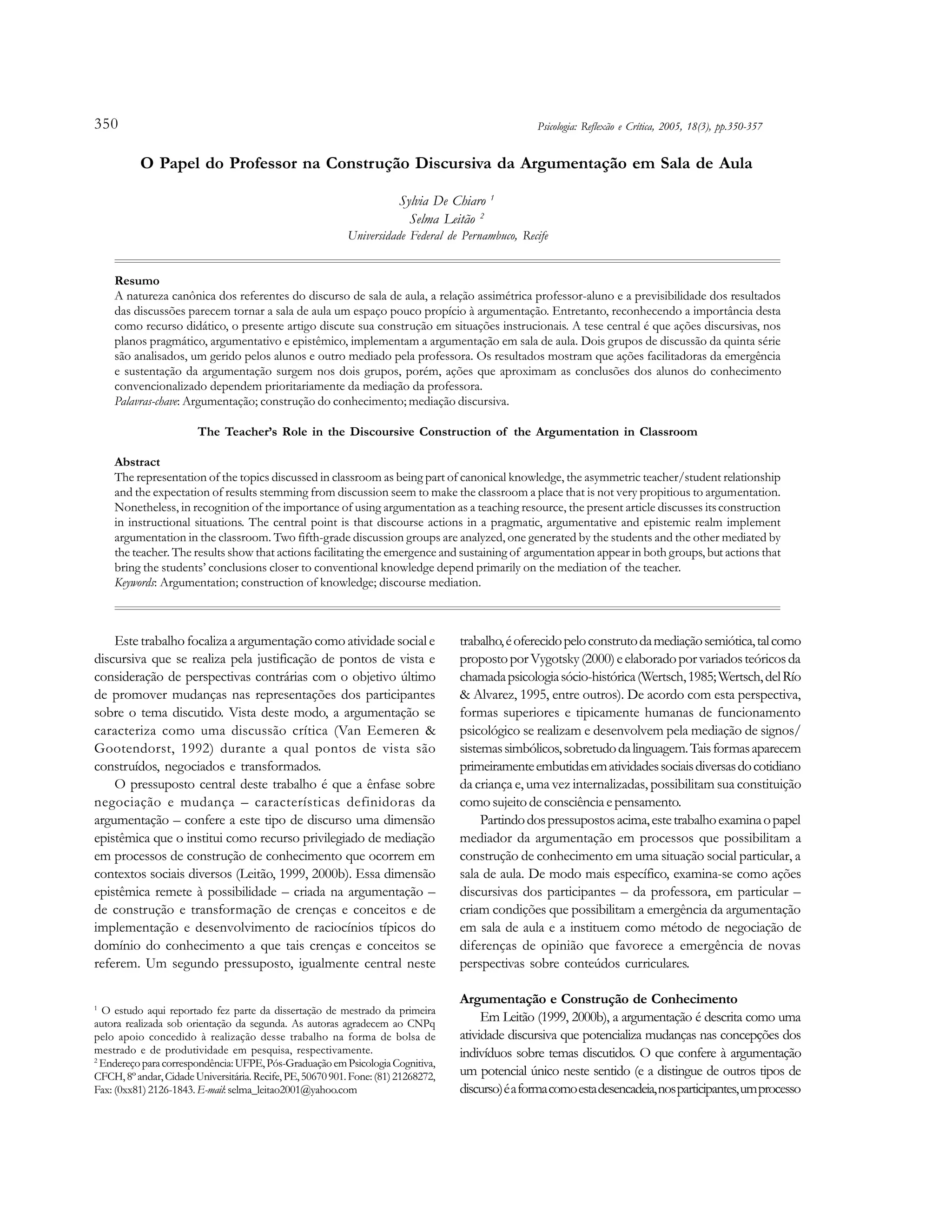 Este artigo analisa como a mediação do professor constrói a argumentação em sala de aula. A argumentação é vista como atividade social que promove mudanças nas perspectivas dos participantes. Dois grupos de discussão são analisados, um gerido pelos alunos e outro mediado pela professora. Os resultados mostram que ações que aproximam as conclusões dos alunos do conhecimento convencional dependem principalmente da mediação da professora.