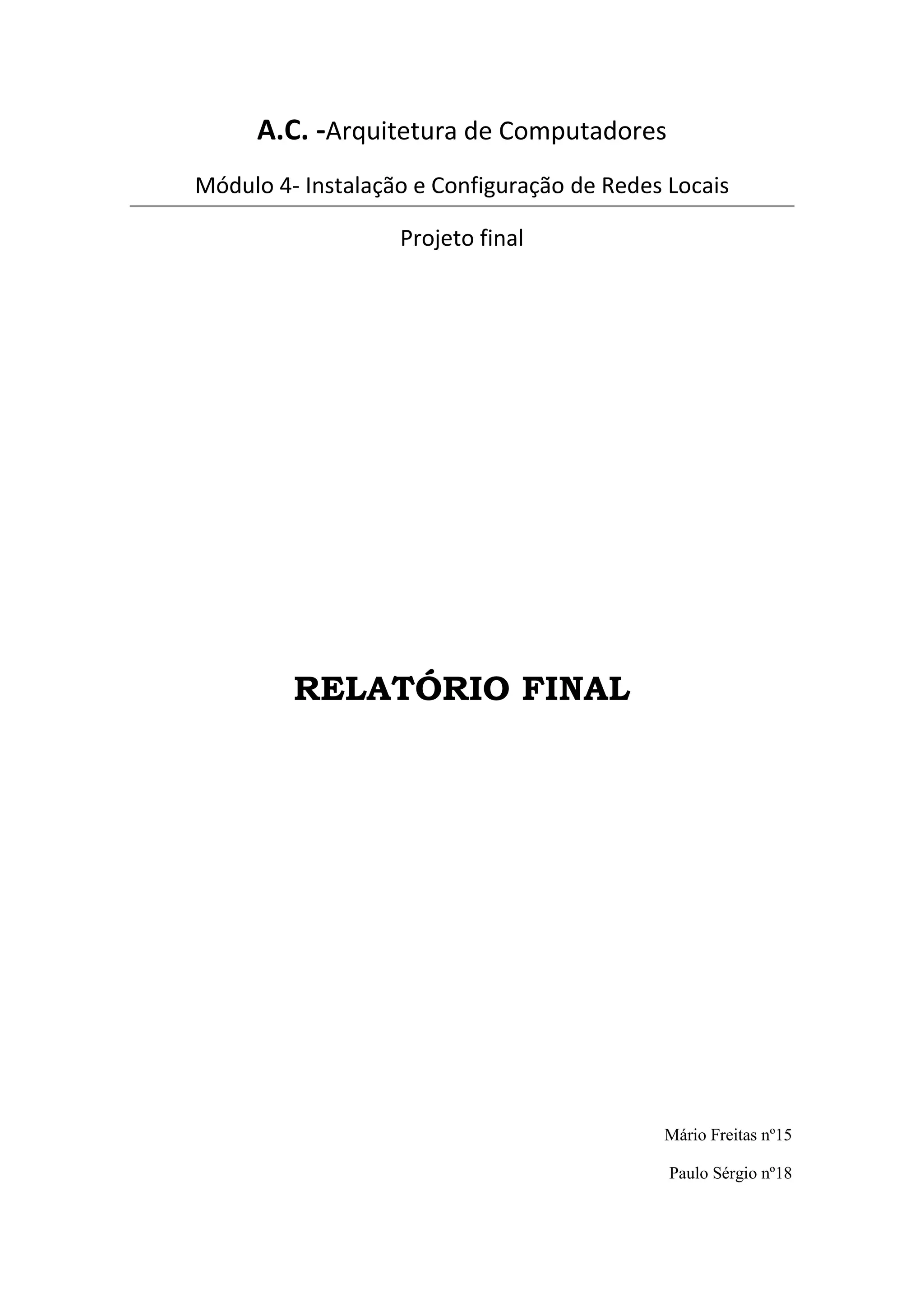 Este relatório descreve um projeto de rede local para uma sala de aula, incluindo a caracterização dos equipamentos de cabagem estruturada, ativos e sua configuração. O orçamento total para o projeto foi de 1128,97€, cobrindo itens como 30 tomadas de rede, um armário de rede, um patch panel, um switch de 24 portas, um router, e cabos de rede.