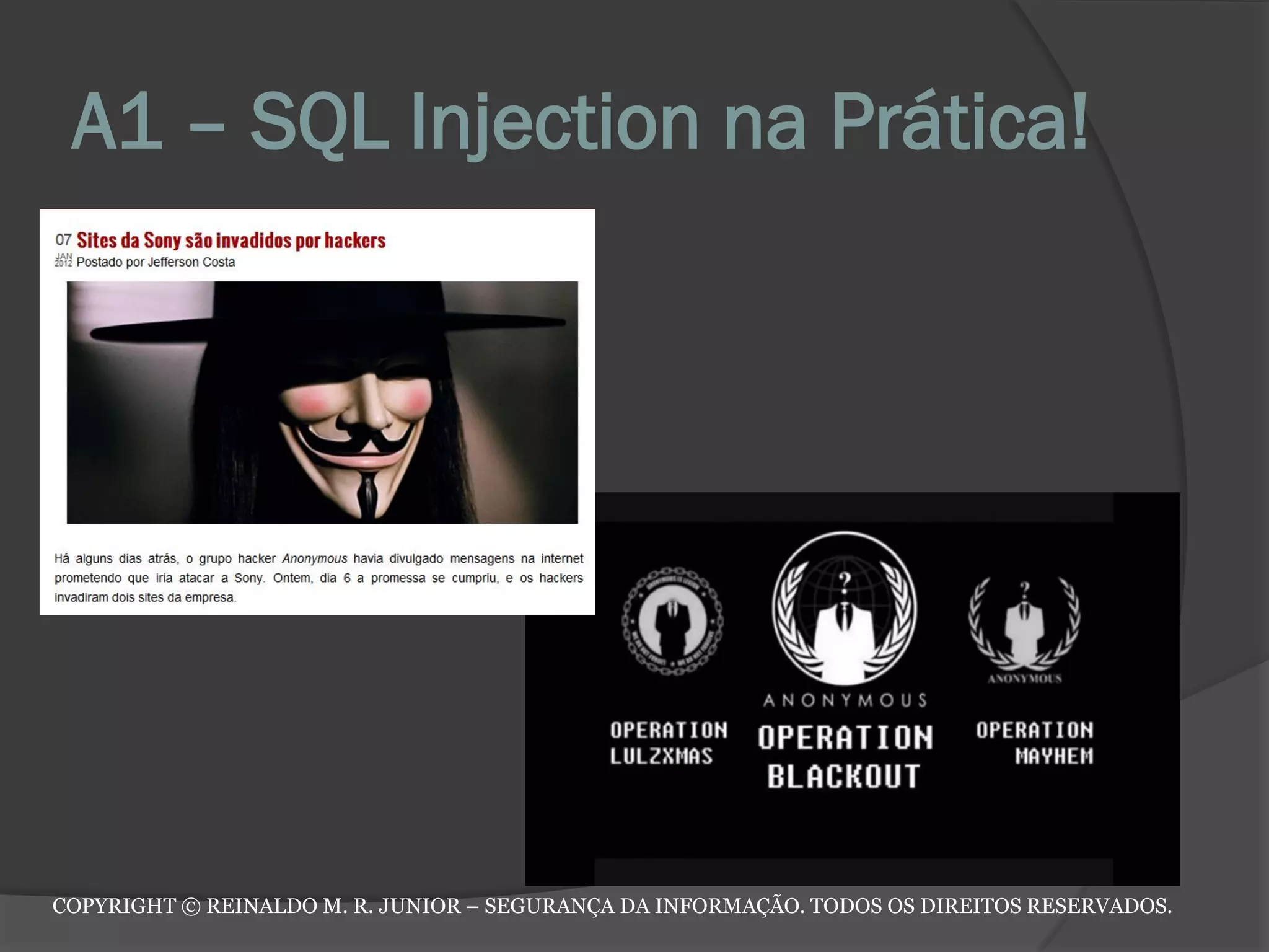 O documento discute SQL injection, incluindo o que é, implicações e exemplos. Ele fornece exemplos reais de SQL injection, código-fonte vulnerável e exercícios para testar vulnerabilidades em um servidor OWASP. Referências adicionais sobre injeção de código e prevenção são fornecidas no final.
