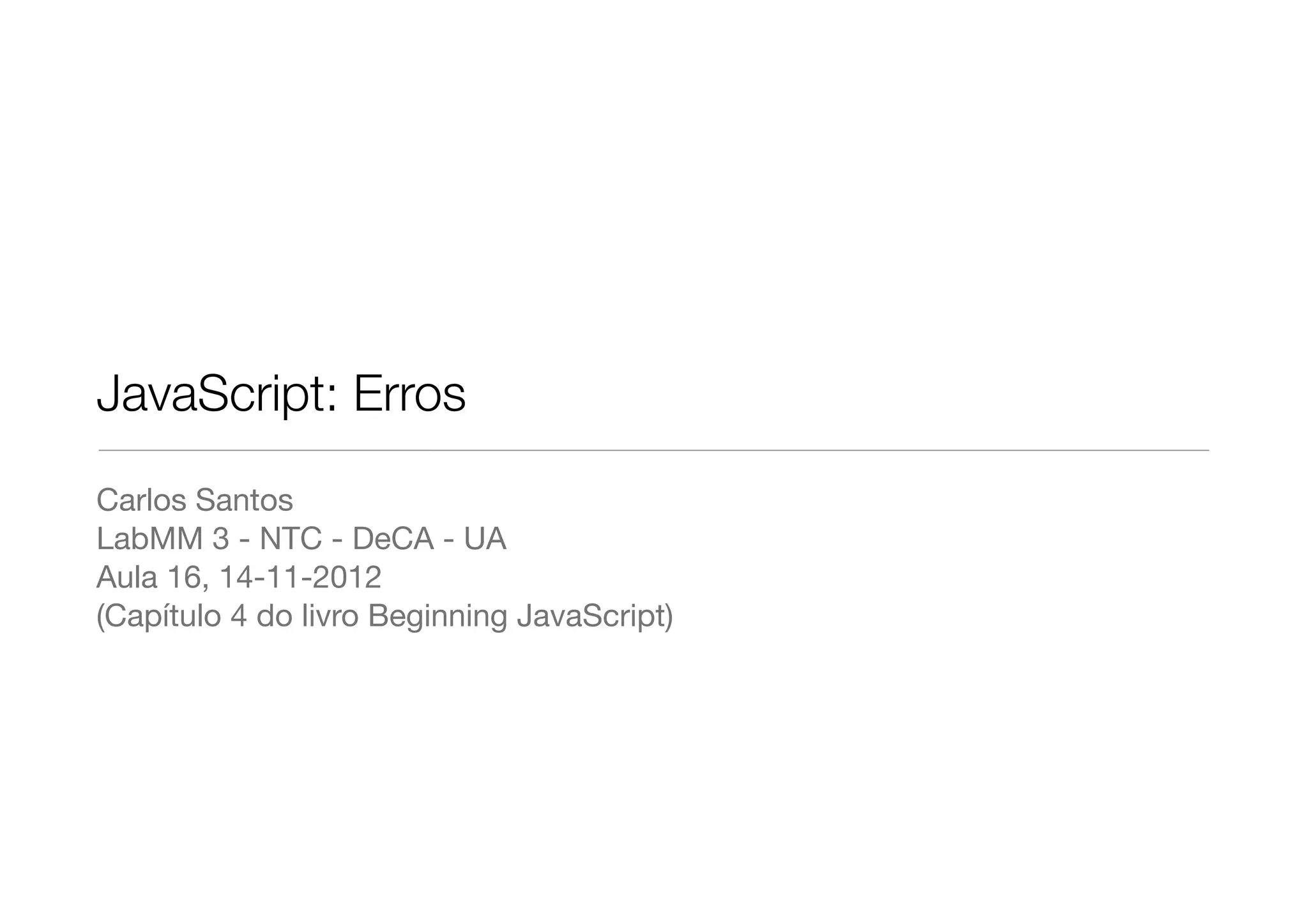 Este documento discute erros comuns em JavaScript e estratégias para depuração. Ele lista erros como variáveis não definidas, sensibilidade a maiúsculas e minúsculas, falta de fechamento de chaves e parênteses, uso incorreto de atribuição e concatenação, e fornece exemplos. Também descreve como tentar, catch e debug podem ser usados para interceptar e lidar com erros, e quais ferramentas de depuração são úteis para depurar código JavaScript.