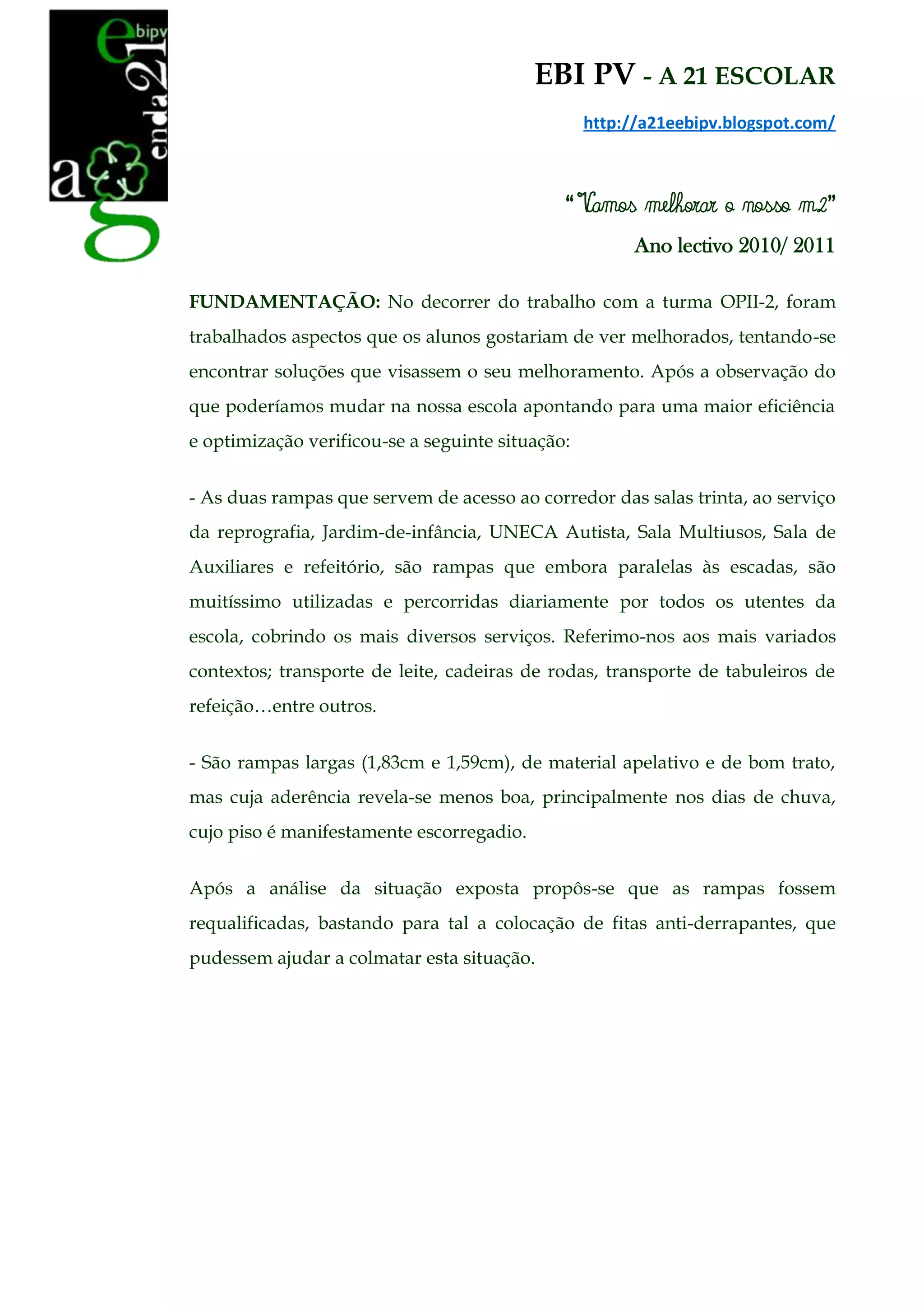 Este documento descreve um projeto para melhorar o acesso às rampas na escola EBIPV através da colocação de fitas antiderrapantes. O projeto envolve alunos cortando e colocando as fitas nas rampas e documentando o processo através de fotos. O projeto ocorrerá entre 30 de Maio e 3 de Junho.