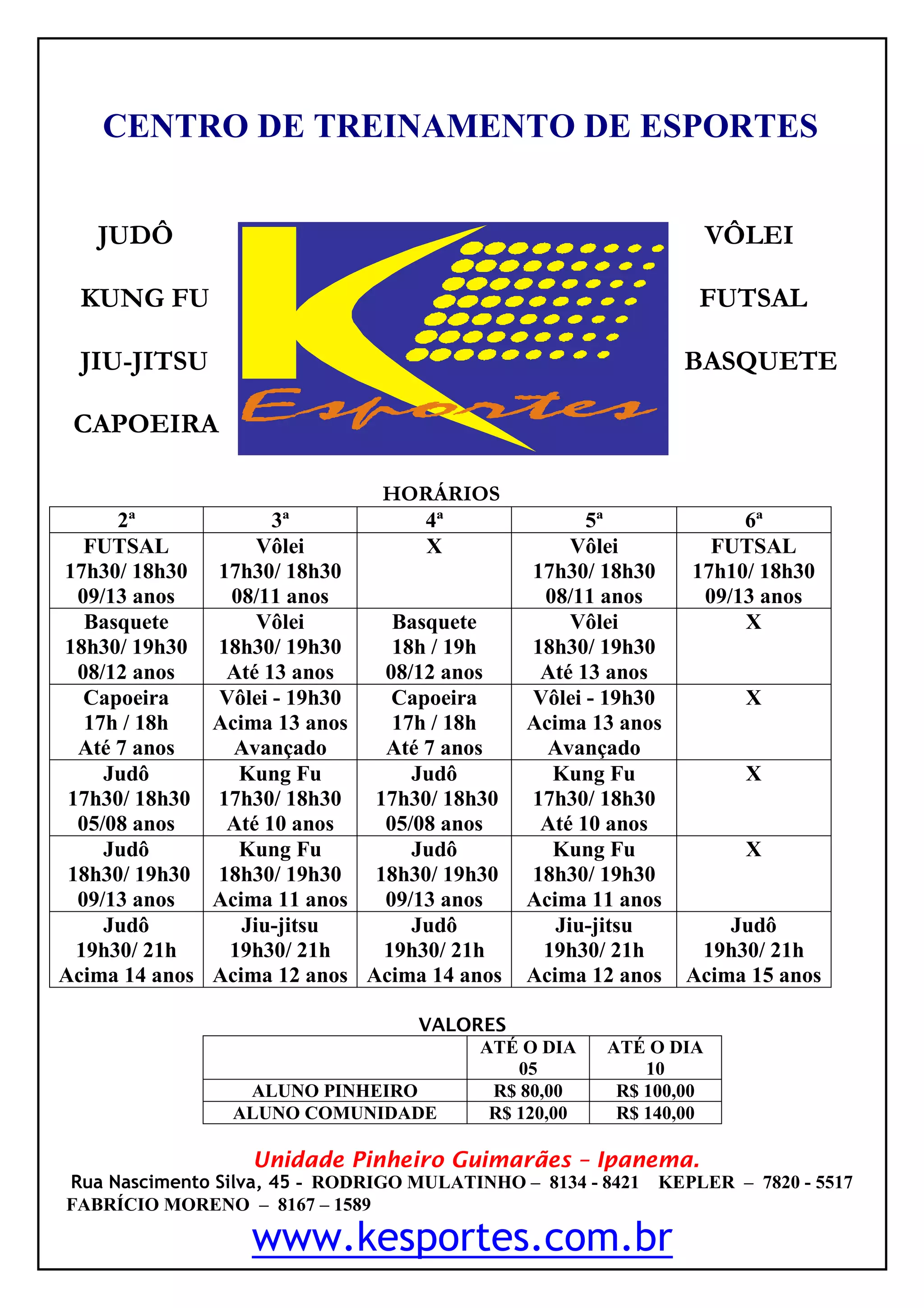 O documento fornece o horário de aulas de diferentes esportes como judô, kung fu, vôlei, futsal, basquete e capoeira para diferentes faixas etárias, bem como os valores para alunos da comunidade local e de fora. As aulas ocorrem de segunda a sábado em diferentes horários para crianças e adolescentes.