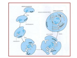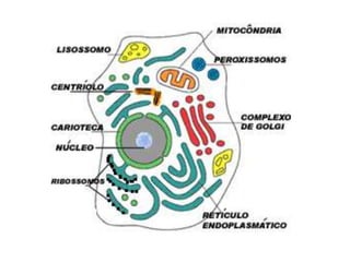 O documento descreve a origem e evolução da célula, desde as primeiras células procariontes que surgiram na Terra há 3,5 bilhões de anos até as complexas células eucariontes atuais. Discorre sobre como moléculas orgânicas simples se combinaram para formar as primeiras células vivas e como essas células evoluíram compartimentalização, núcleo e outros orgânulos, permitindo a vida multicelular.