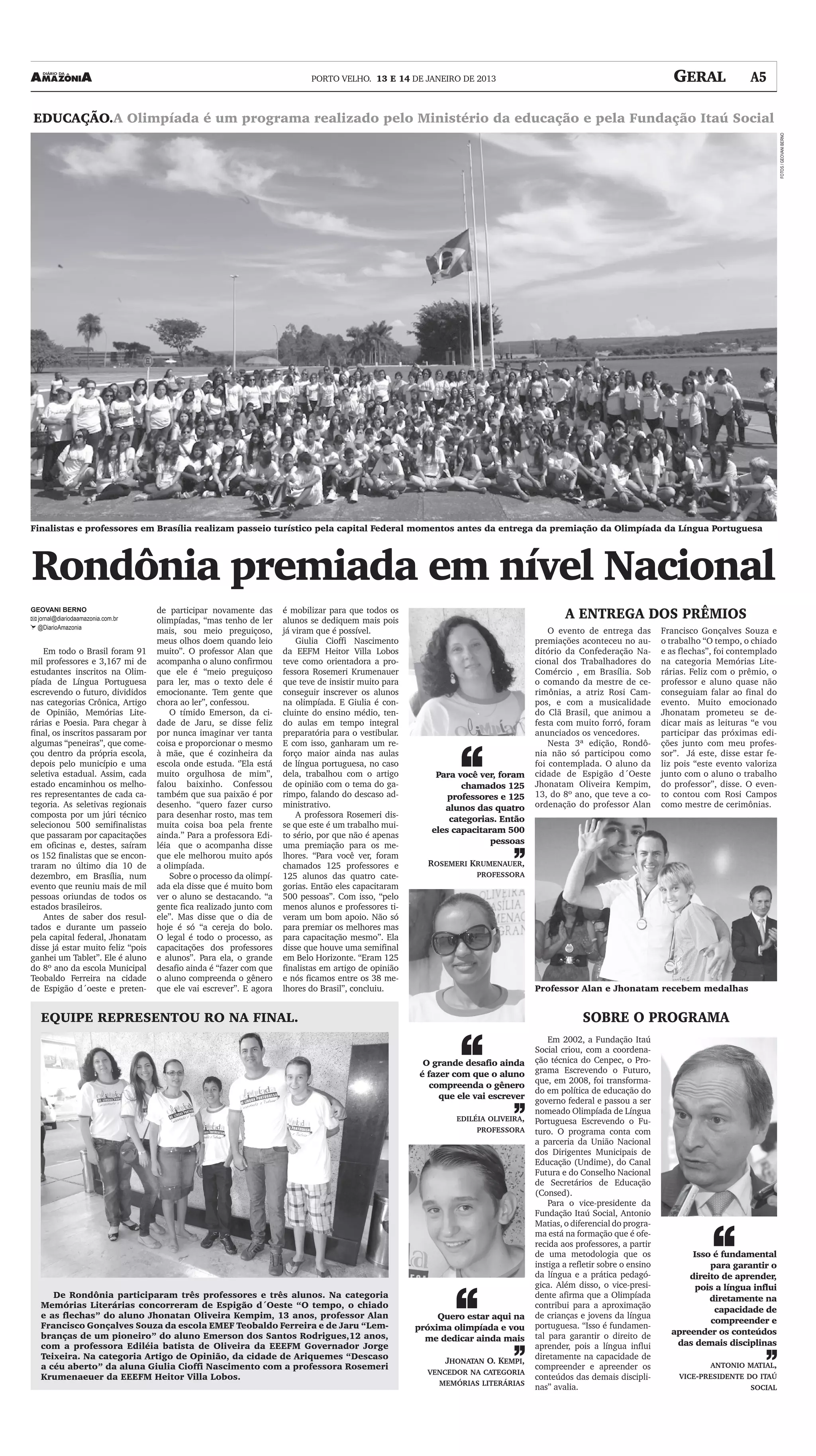 Rondônia teve três finalistas na Olimpíada Nacional de Língua Portuguesa: um aluno de Espigão d'Oeste que venceu na categoria Memórias Literárias e dois alunos de Jaru e Ariquemes. A competição reuniu mais de mil pessoas de todo o Brasil e premia os melhores trabalhos nas categorias de Crônica, Artigo de Opinião, Memórias Literárias e Poesia.