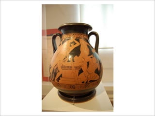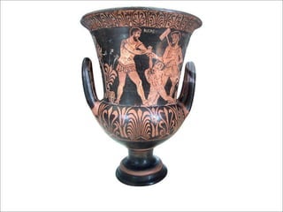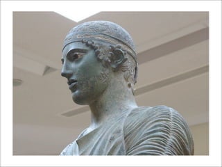 O documento resume a arte grega, dividida em três períodos: Arcaico (800-500 a.C.), Clássico (500-338 a.C.) e Helenístico (338-146 a.C.). O período Clássico é caracterizado pela precisão anatômica e equilíbrio das obras, sob liderança de Fídias. O Helenístico traz maior liberdade de expressão e detalhismo.